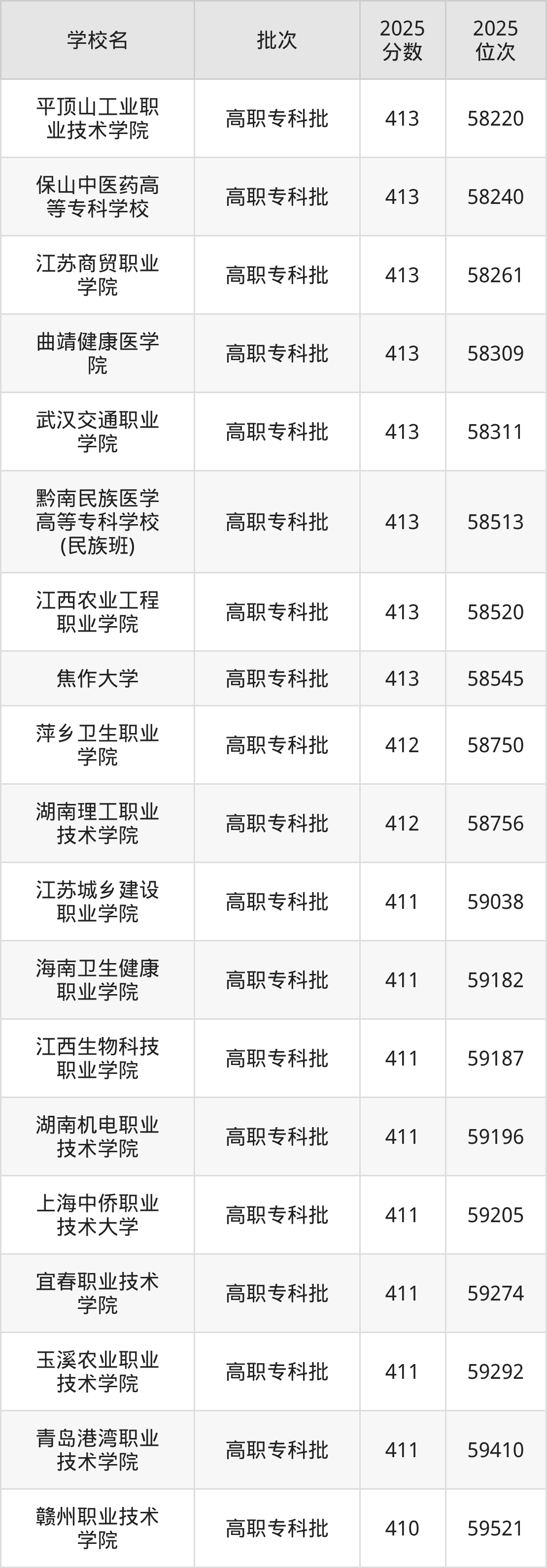 2025年贵州高考历史类412分(58638名~59035名)能上的大学有湖南理工职业技术学院、萍乡卫生职业学院。