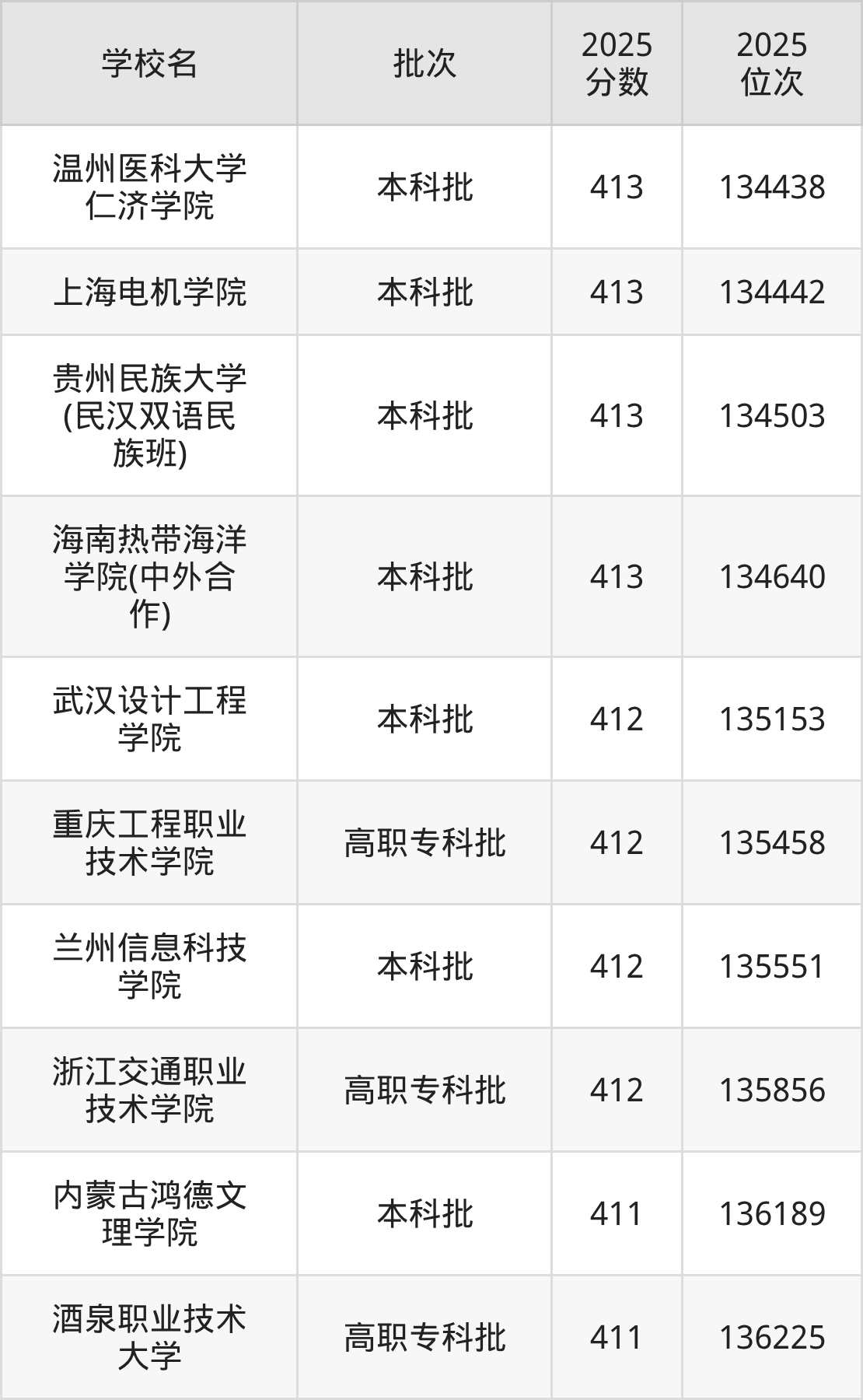 2025年贵州高考物理类412分(134932名~135861名)能上的大学有兰州信息科技学院、浙江交通职业技术学院、重庆工程职业技术学院、武汉设计工程学院。