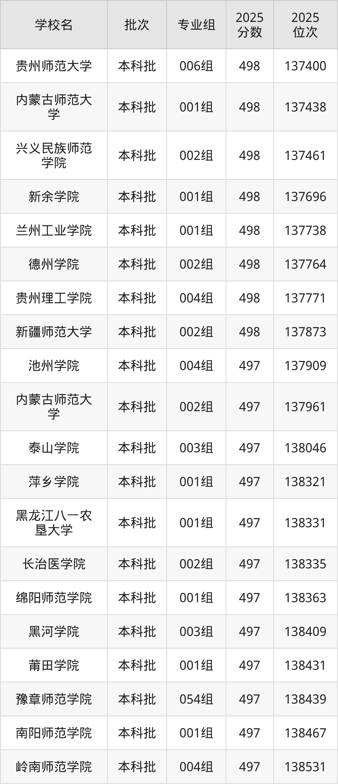 另外录取位次低于该区间(较稳妥)的有内蒙古农业大学003组(139470名)、新疆政法学院001组(139526名)等;录取位次高于该区间(可冲)的有新疆师范大学002组(137873名)、贵州理工学院004组(137771名)等。