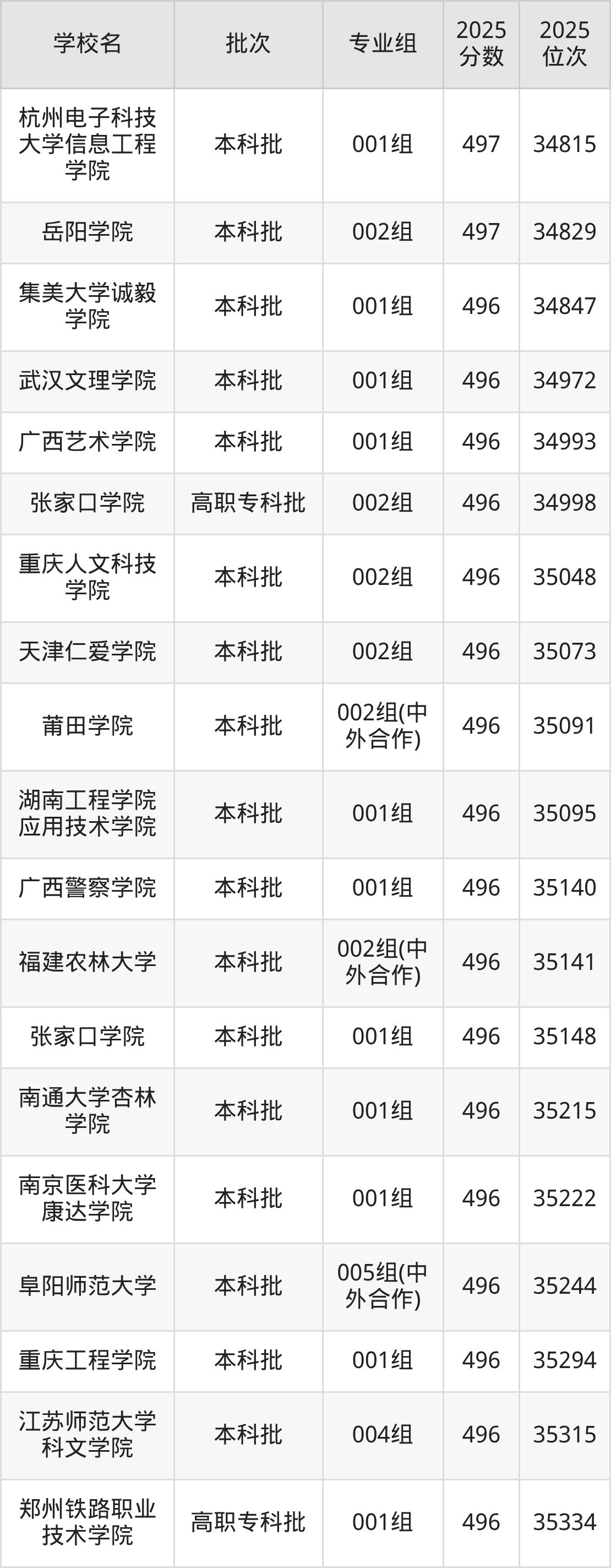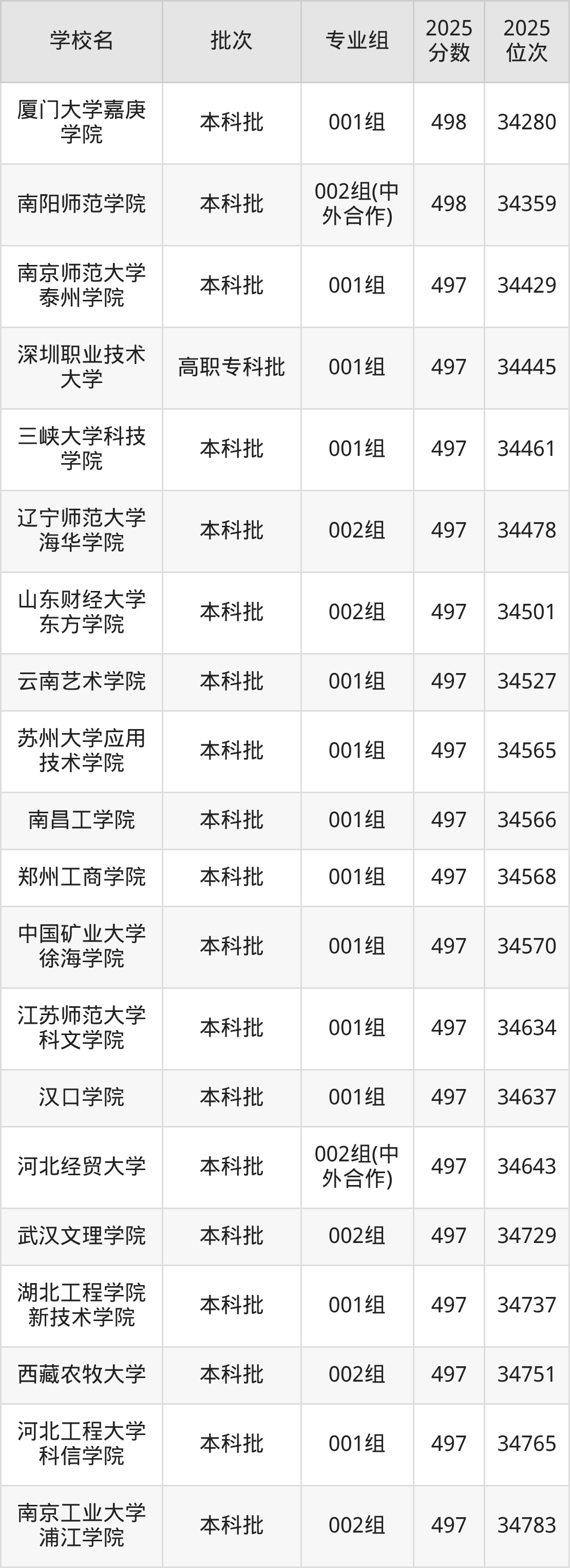 2025年安徽高考历史类497分(34385名~34845名)能上的大学有汉口学院001组、河北经贸大学002组(中外合作)、南昌工学院001组、武汉文理学院002组等。