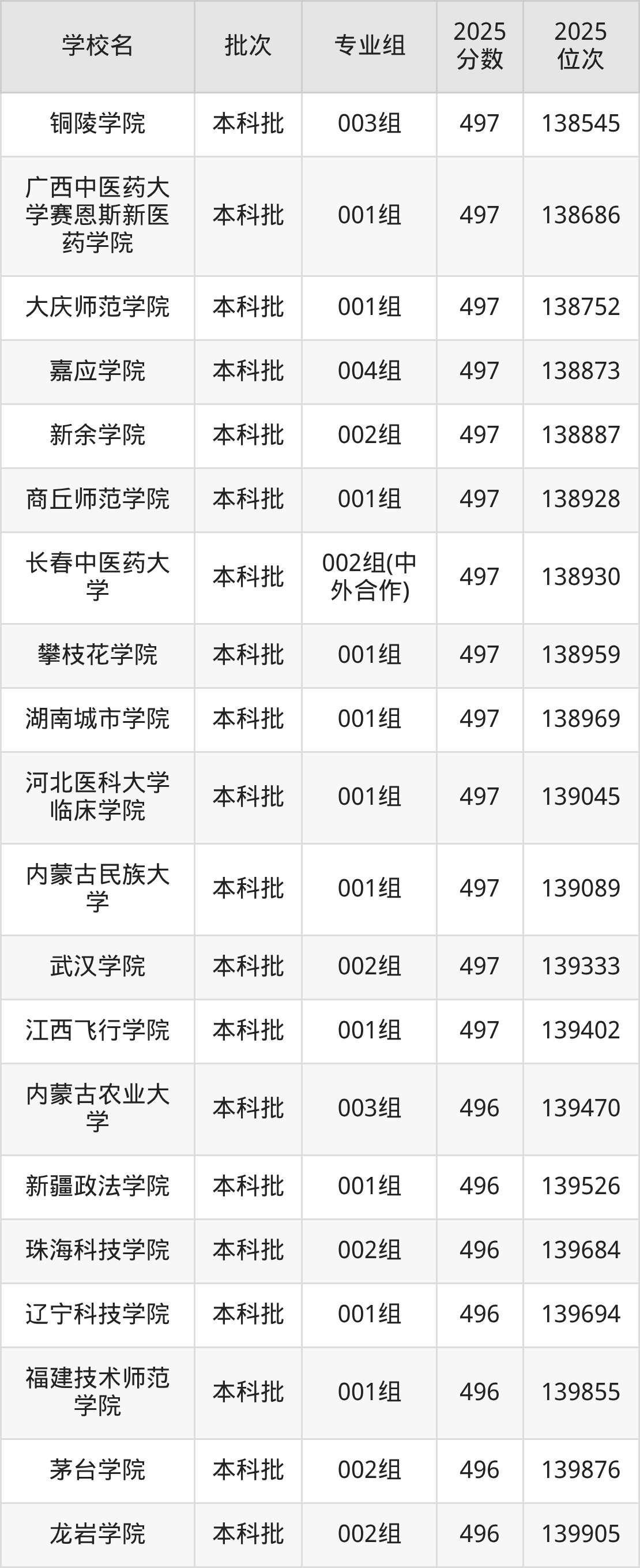 2025年安徽高考物理类497分(137899名~139469名)能上的大学有长春中医药大学002组(中外合作)、长治医学院002组、大庆师范学院001组、黑河学院003组等。