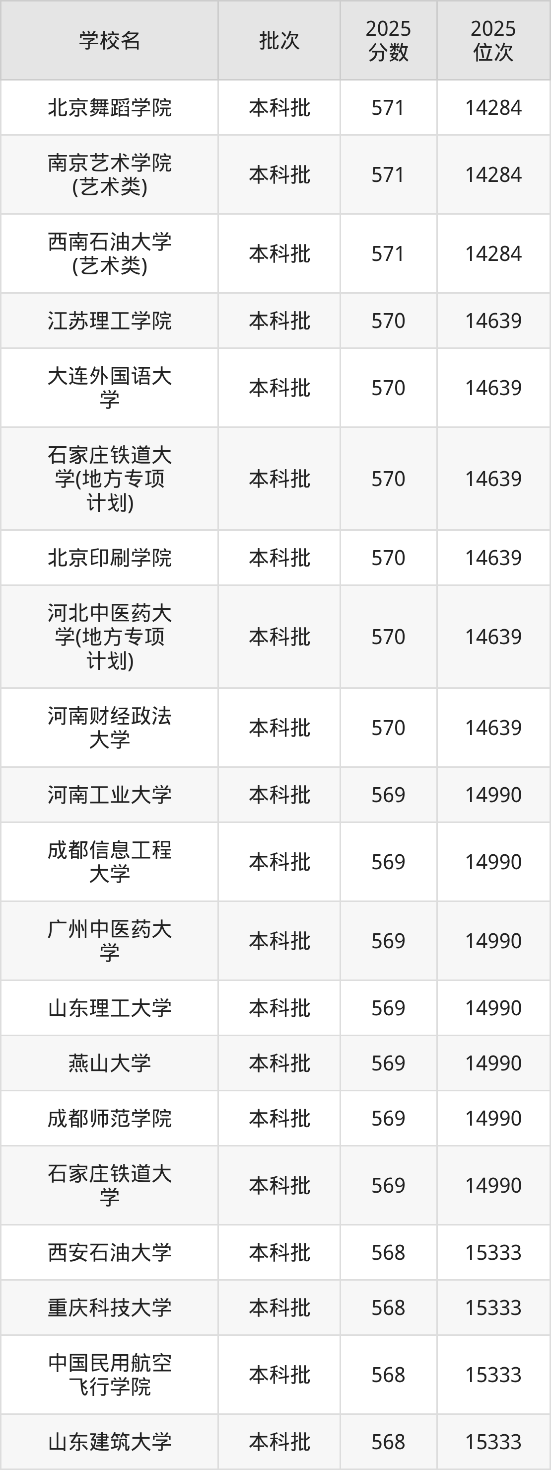 2025年河北高考历史类569分(14640名~14990名)能上的大学有广州中医药大学、山东理工大学、燕山大学、成都师范学院等。