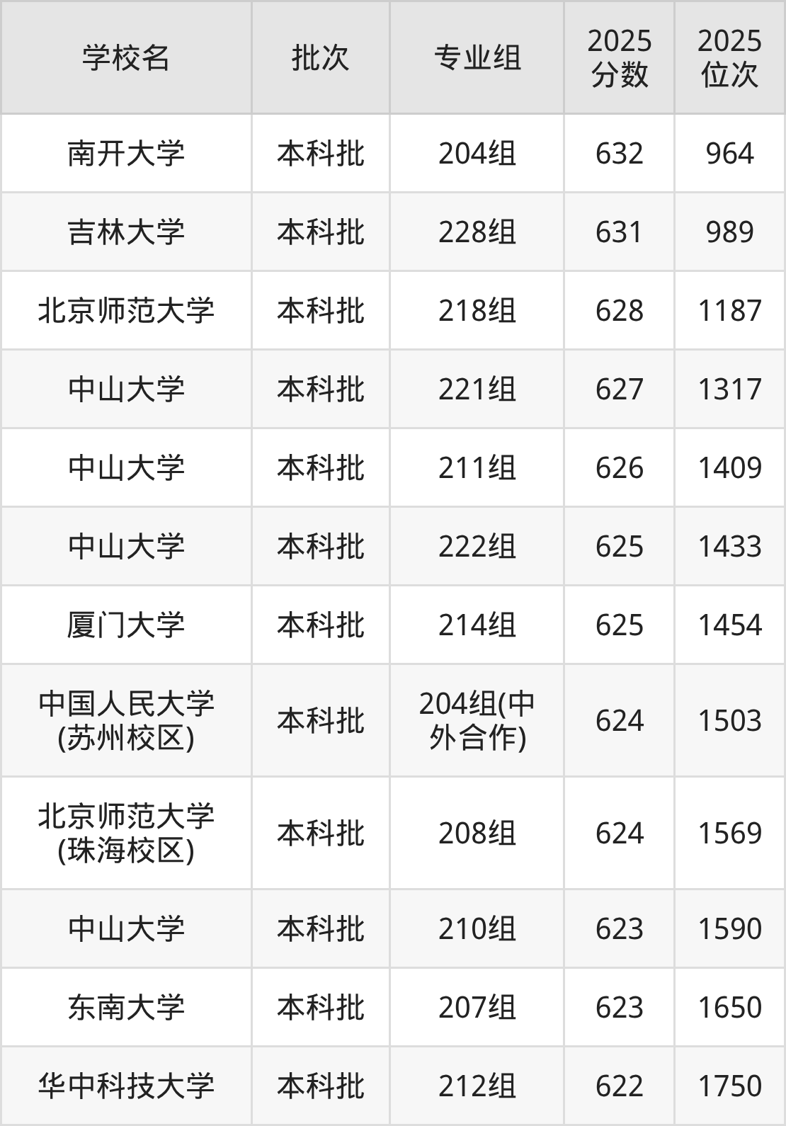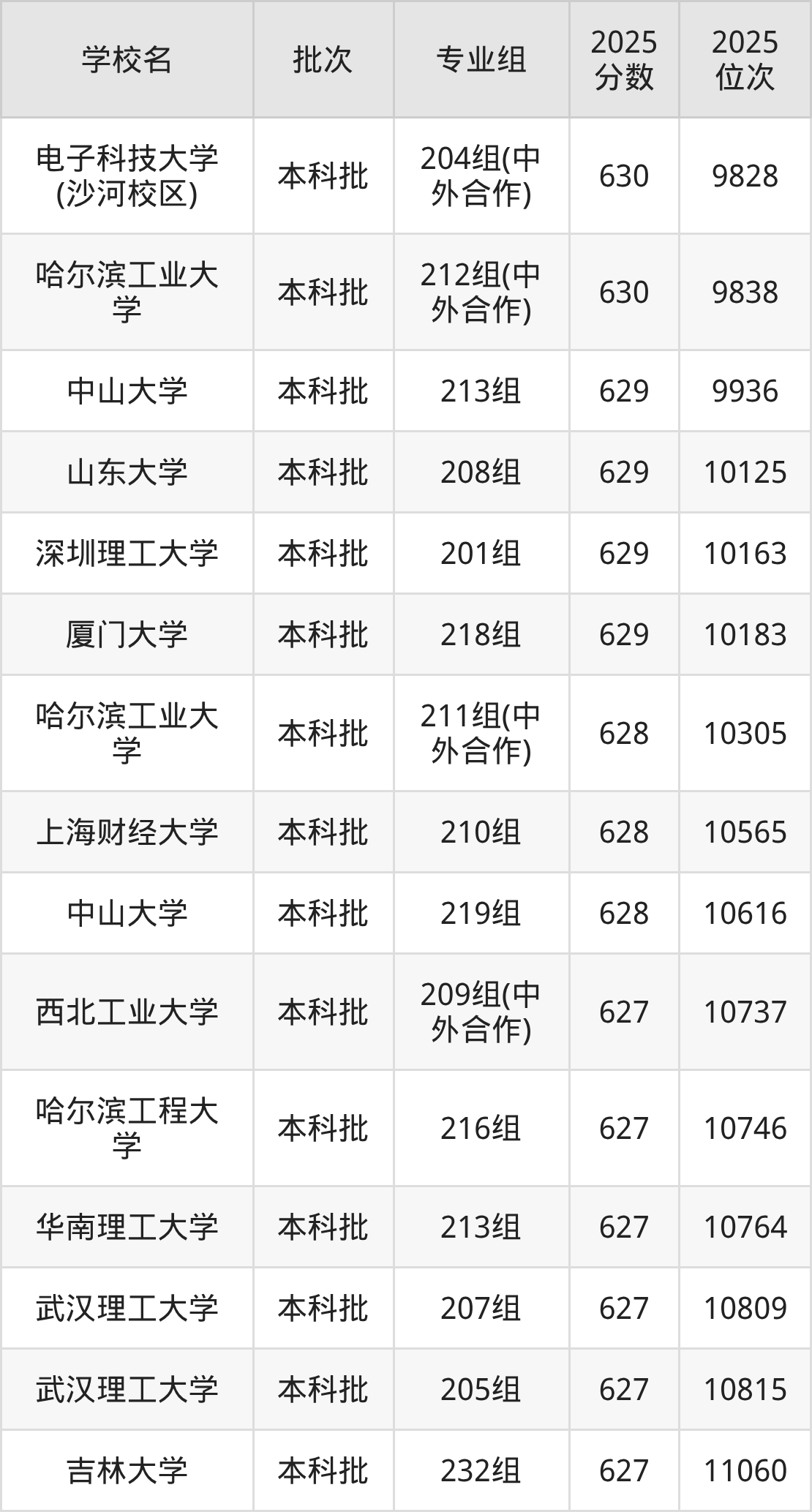 2025年广东高考物理类628分(10243名~10670名)能上的大学有哈尔滨工业大学211组(中外合作)、上海财经大学210组、中山大学219组。