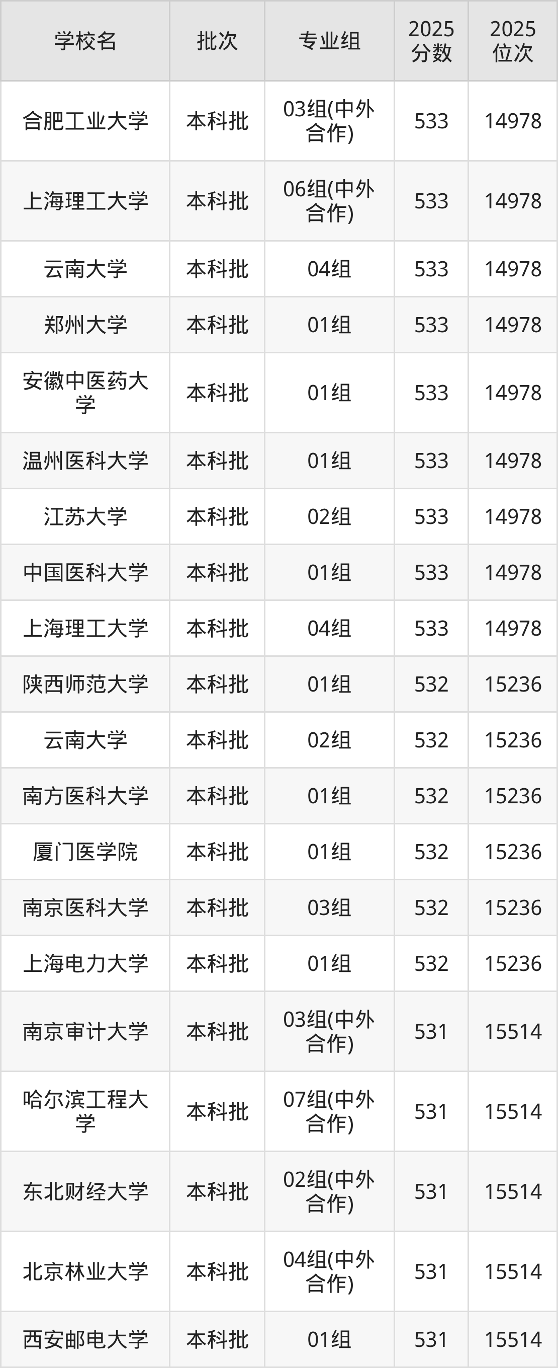 2025年上海高考531分(15237名~15514名)能上的大学有上海理工大学02组、华东政法大学03组、上海戏剧学院01组、上海师范大学01组等。