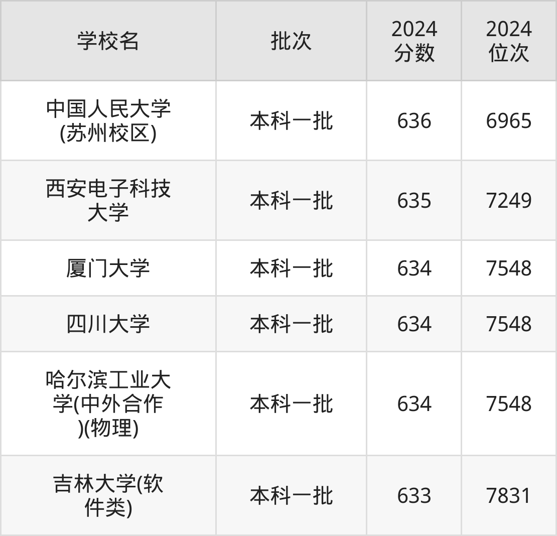2024年河南高考理科634分(7250名~7548名)能上的大学有厦门大学、四川大学、哈尔滨工业大学(中外合作)(物理)。