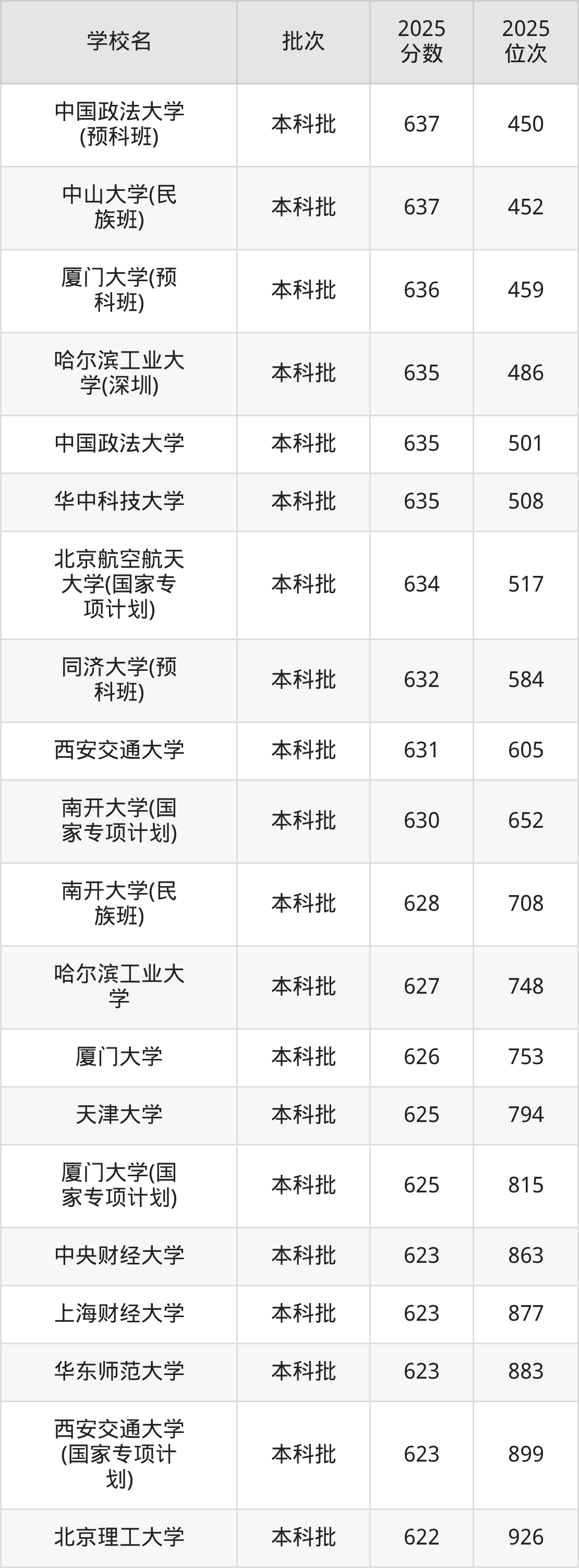 另外录取位次低于该区间(较稳妥)的有同济大学(预科班)(584名)、西安交通大学(605名)等;录取位次高于该区间(可冲)的有华中科技大学(508名)、中国政法大学(501名)等。