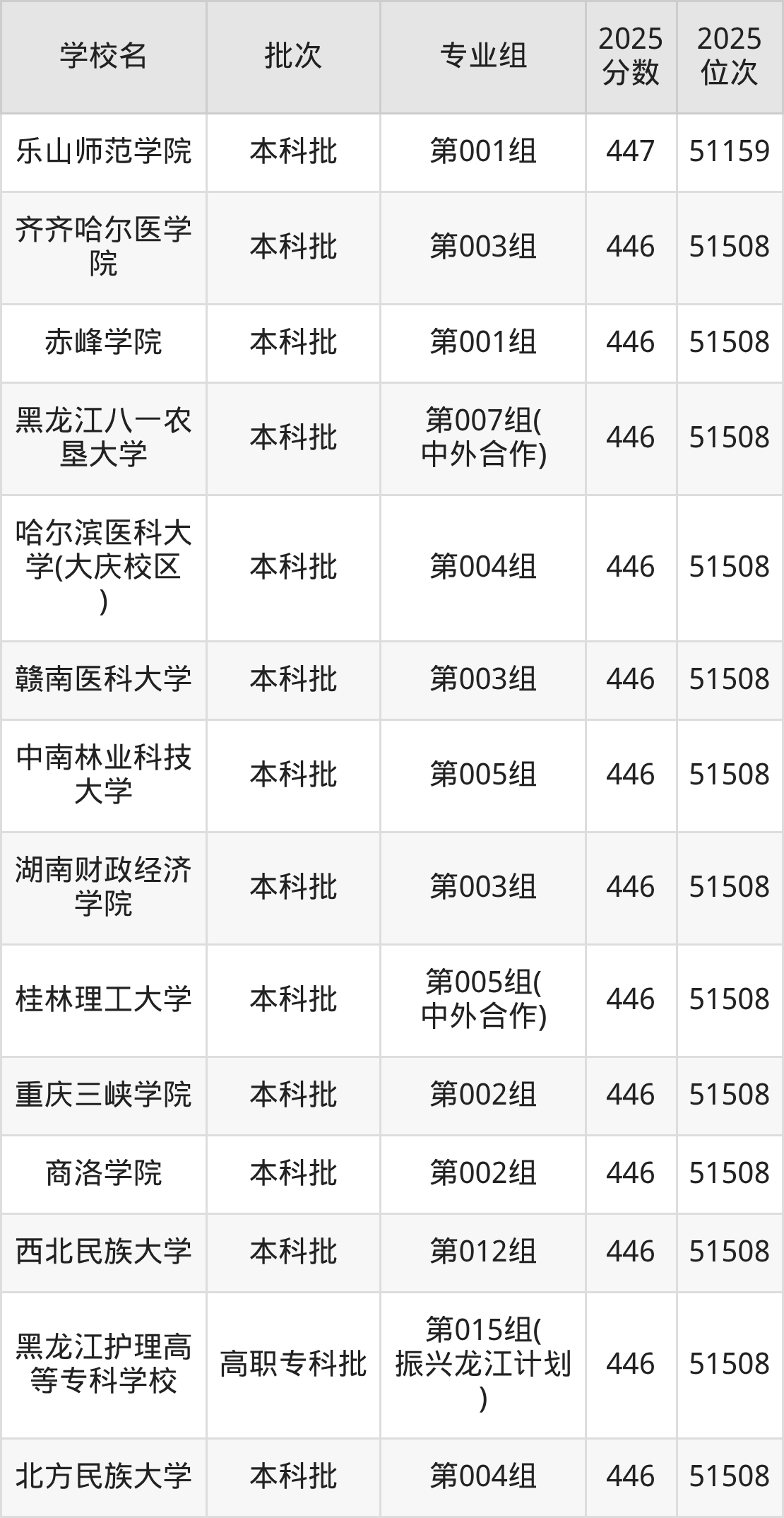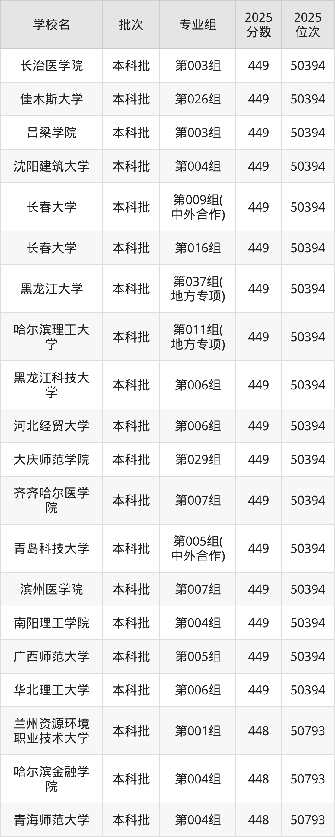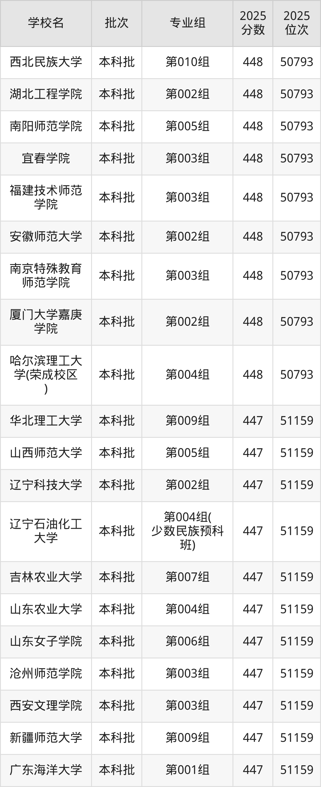 2025年黑龙江高考物理类447分(50794名~51159名)能上的大学有华北理工大学第009组、沧州师范学院第003组、山西师范大学第005组、辽宁科技大学第002组等。