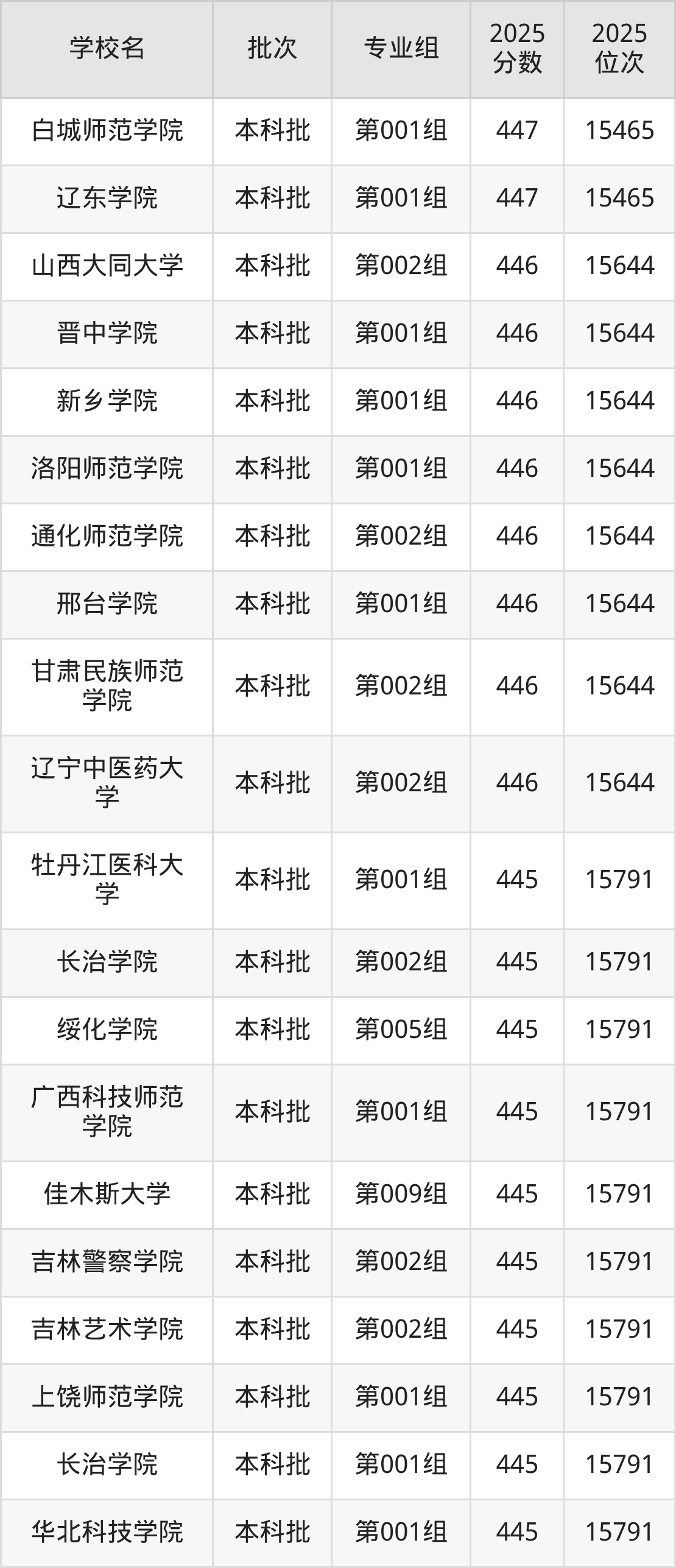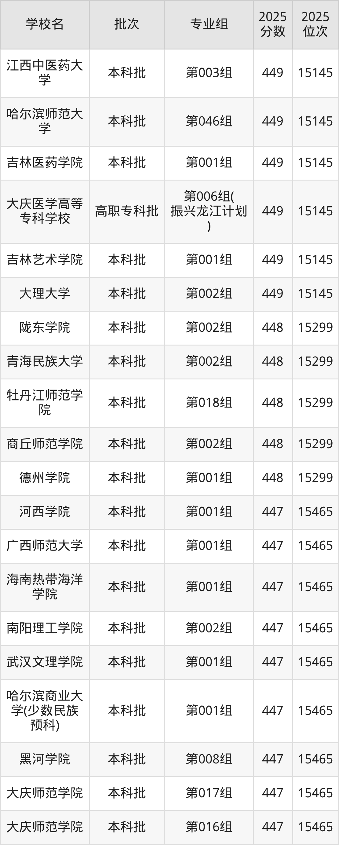 2025年黑龙江高考历史类447分(15300名~15465名)能上的大学有辽东学院第001组、白城师范学院第001组、大庆师范学院第016组、大庆师范学院第017组等。