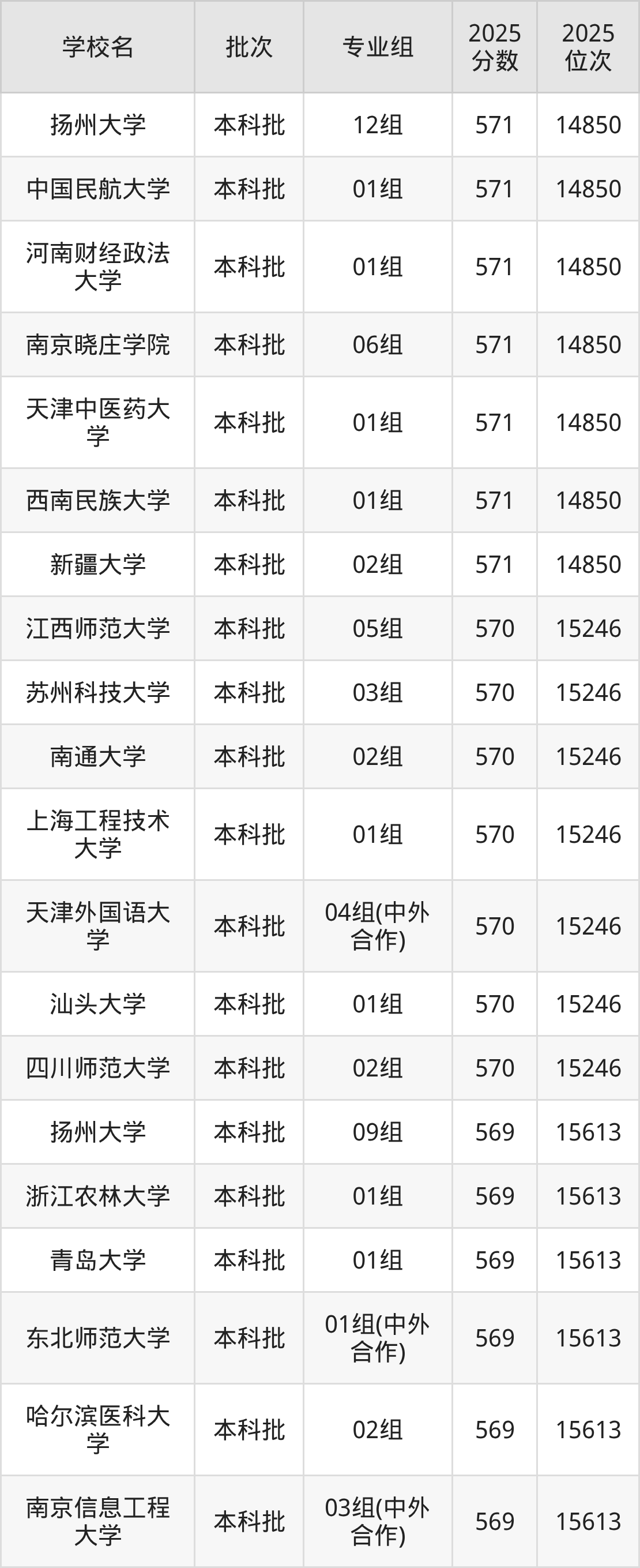 2025年江苏高考历史类569分(15247名~15613名)能上的大学有南京信息工程大学03组(中外合作)、扬州大学09组、浙江农林大学01组、青岛大学01组等。