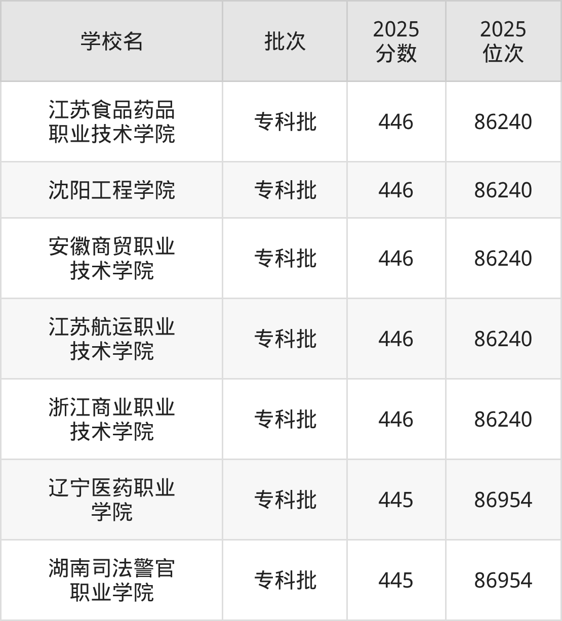 2025年河北高考历史类445分(86241名~86954名)能上的大学有辽宁医药职业学院、湖南司法警官职业学院。