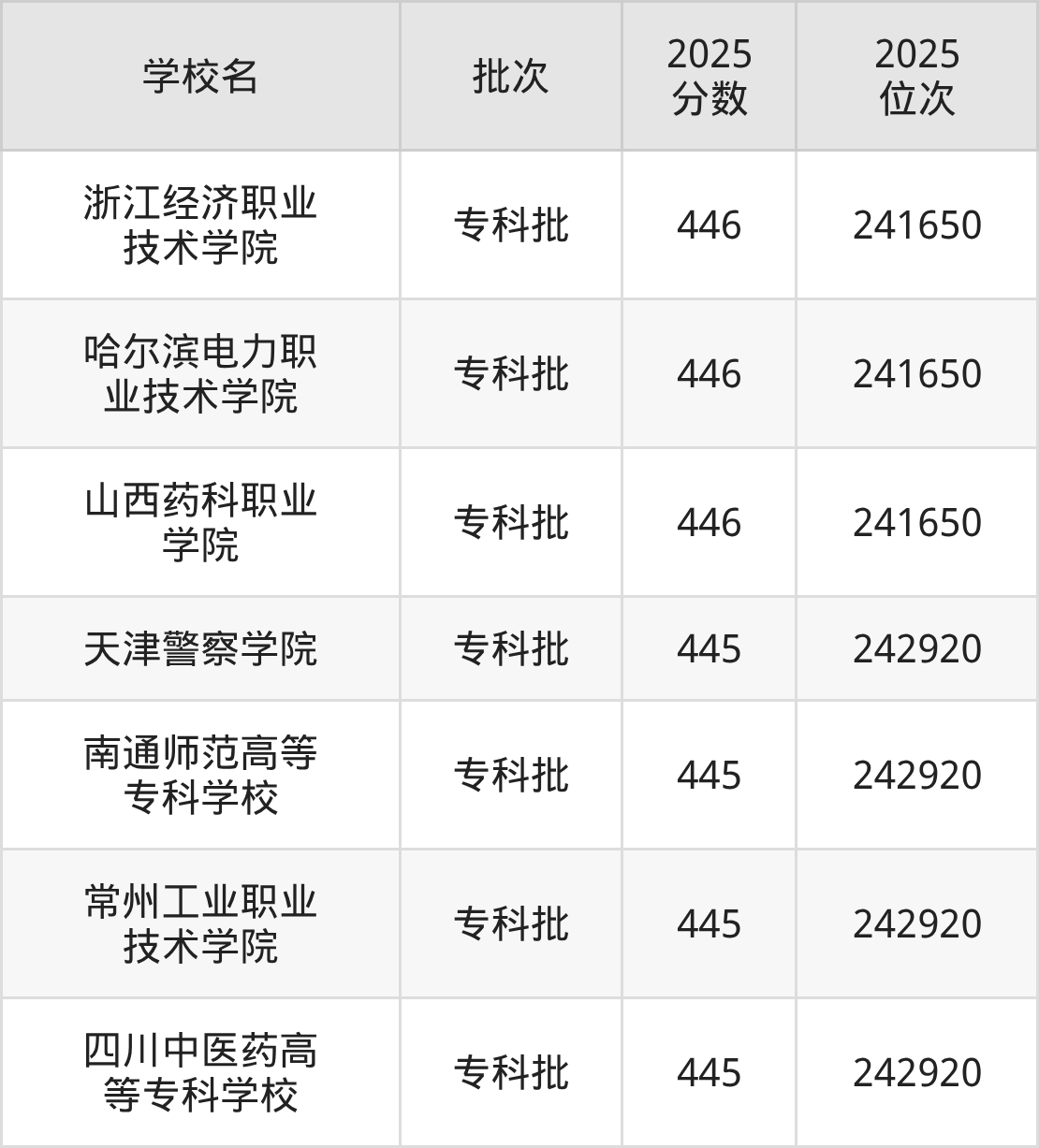 2025年河北高考物理类445分(241651名~242920名)能上的大学有南通师范高等专科学校、天津警察学院、常州工业职业技术学院、四川中医药高等专科学校。