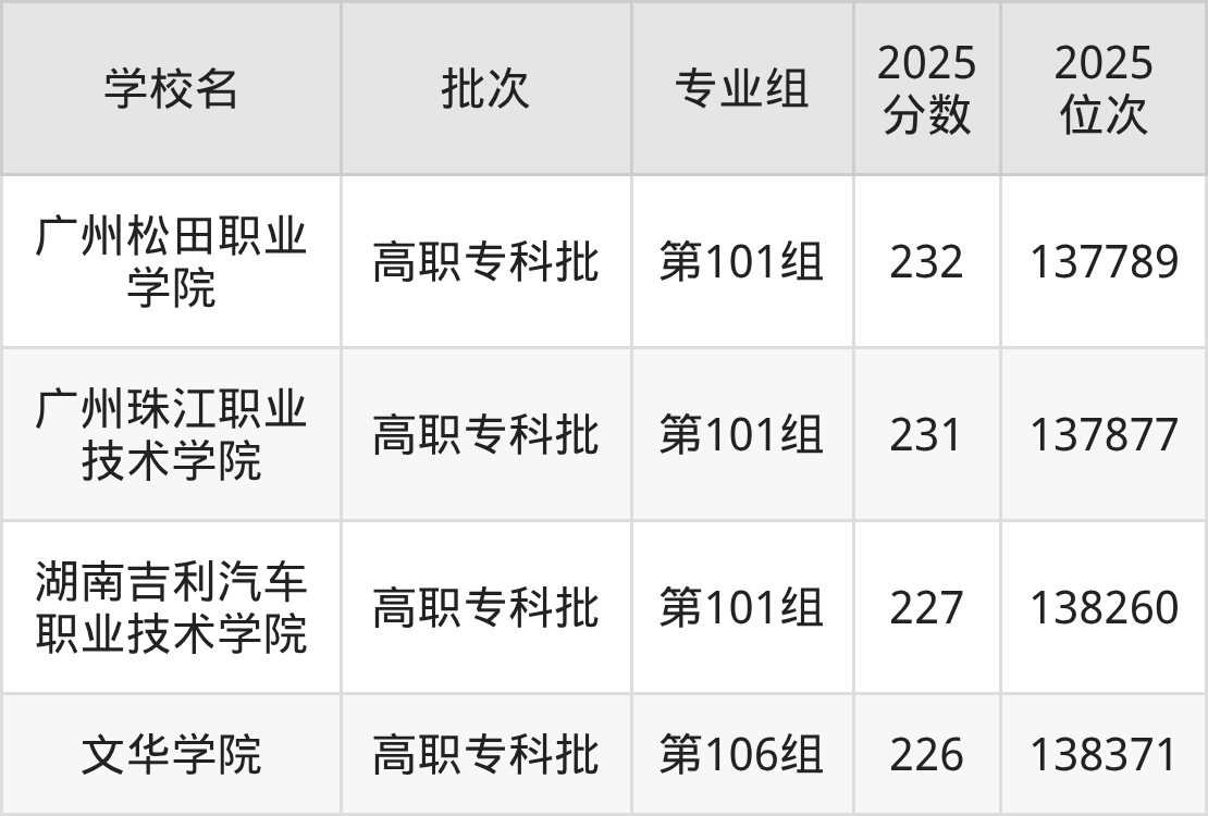 2025年湖南高考历史类230分(137878名~137973名)录取位次低于该区间(较稳妥)的有湖南吉利汽车职业技术学院第101组(138260名)、文华学院第106组(138371名)等;录取位次高于该区间(可冲)的有广州珠江职业技术学院第101组(137877名)、广州松田职业学院第101组(137789名)等。