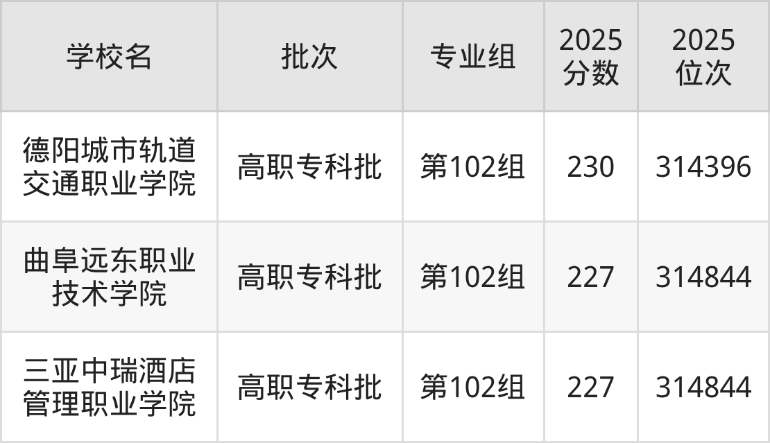 2025年湖南高考物理类230分(314251名~314396名)能上的大学有德阳城市轨道交通职业学院第102组。