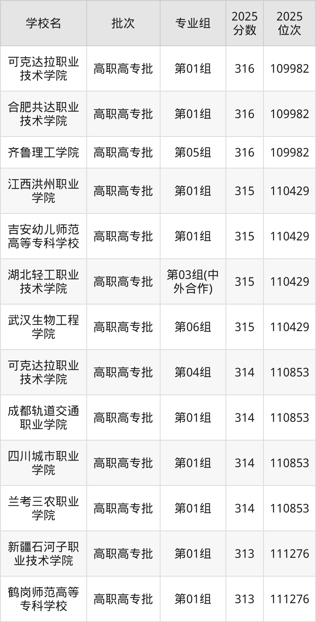 2025年湖北高考历史类314分(110430名~110853名)能上的大学有兰考三农职业学院第01组、四川城市职业学院第01组、成都轨道交通职业学院第01组、可克达拉职业技术学院第04组。