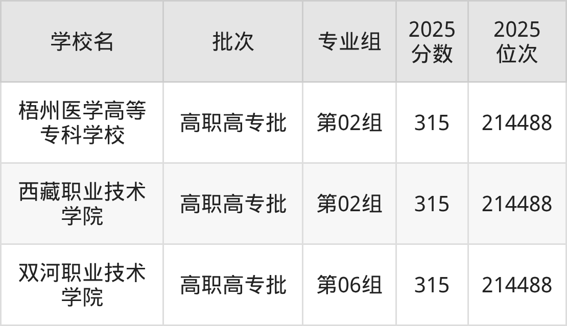 2025年湖北高考物理类314分(214489名~214959名)录取位次低于该区间(较稳妥)的有湖南三一工业职业技术学院第02组(215853名)、新疆和田学院第07组(215853名)等;录取位次高于该区间(可冲)的有梧州医学高等专科学校第02组(214488名)、西藏职业技术学院第02组(214488名)等。