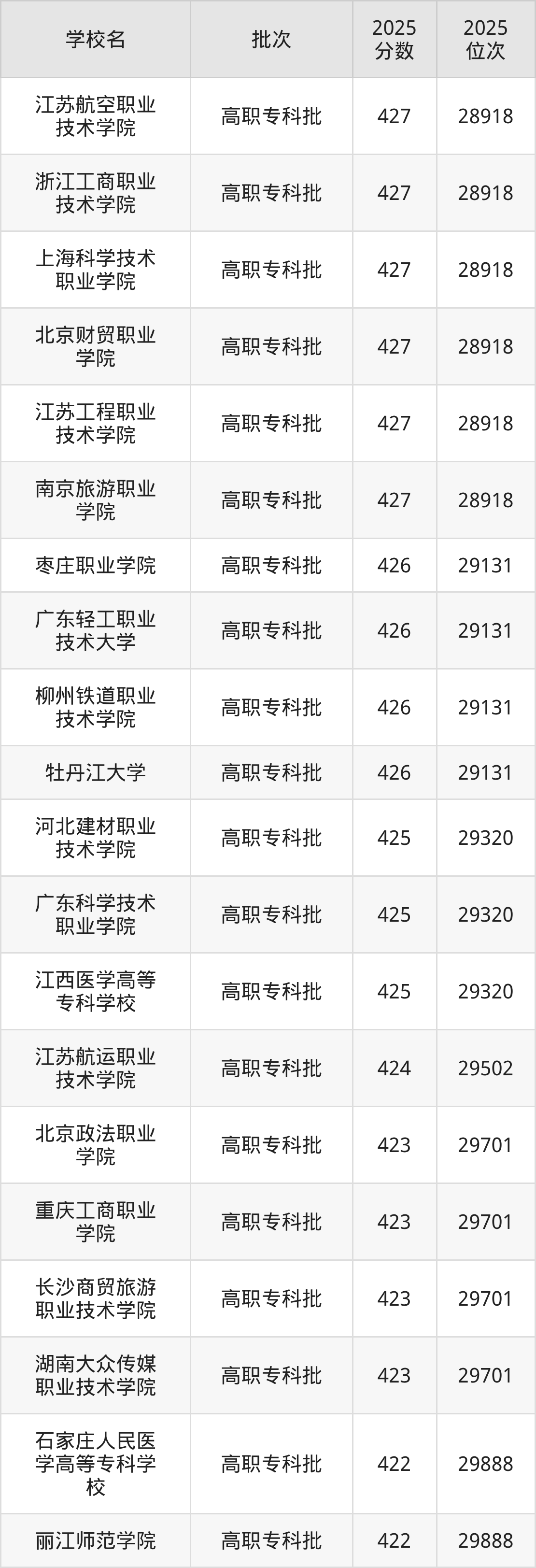 另外录取位次低于该区间(较稳妥)的有湖南大众传媒职业技术学院(29701名)、北京政法职业学院(29701名)等;录取位次高于该区间(可冲)的有广东科学技术职业学院(29320名)、江西医学高等专科学校(29320名)等。