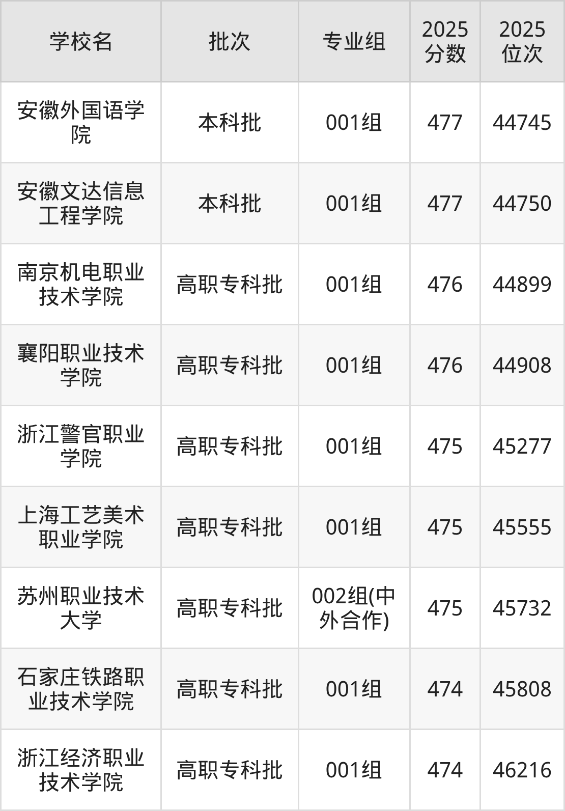 2025年安徽高考历史类475分(45245名~45752名)能上的大学有上海工艺美术职业学院001组、苏州职业技术大学002组(中外合作)、浙江警官职业学院001组。