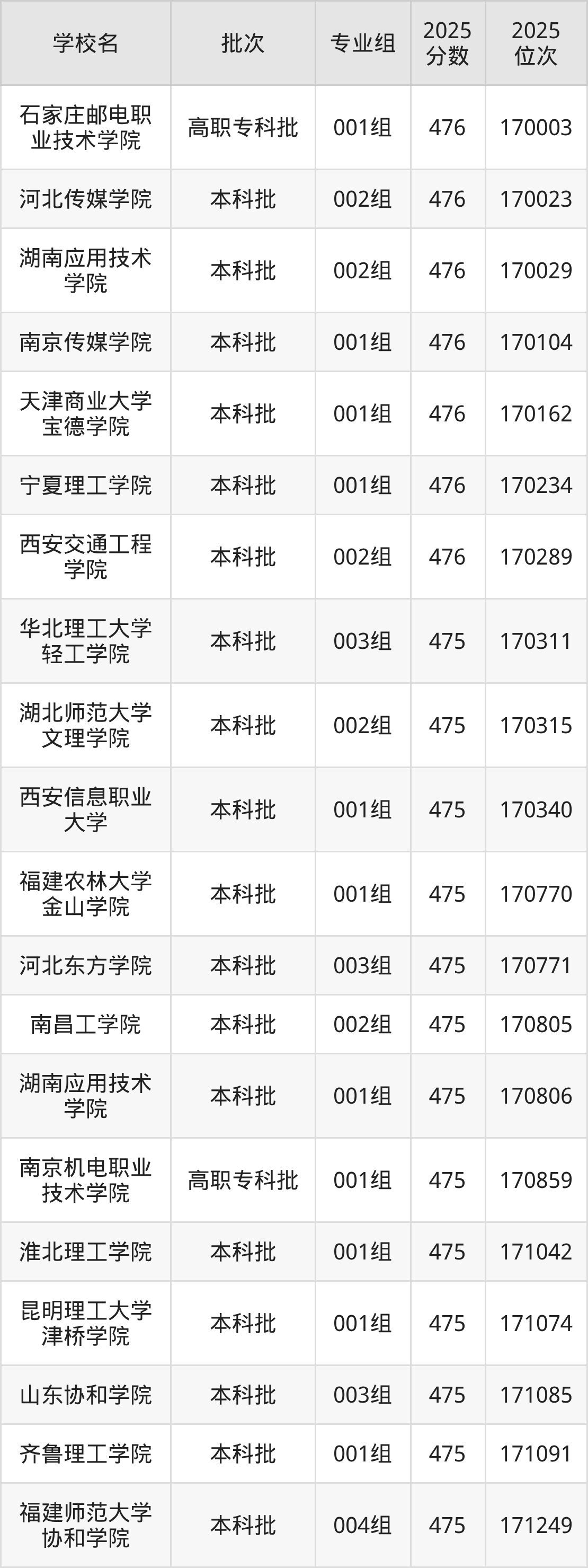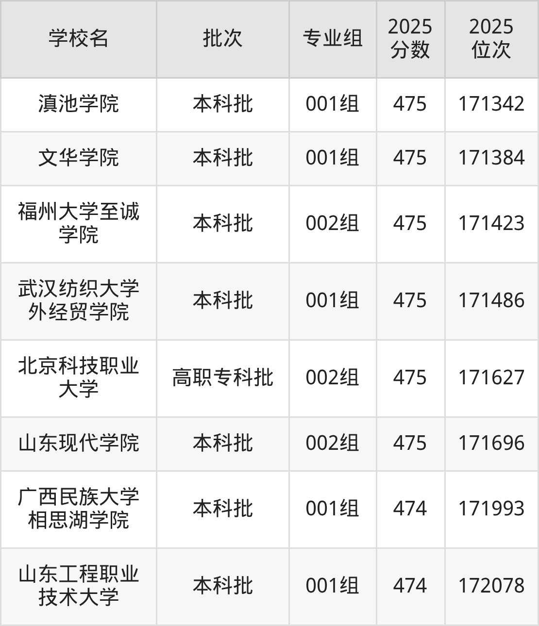 2025年安徽高考物理类475分(170301名~171778名)能上的大学有滇池学院001组、河北东方学院003组、湖南应用技术学院001组、南昌工学院002组等。