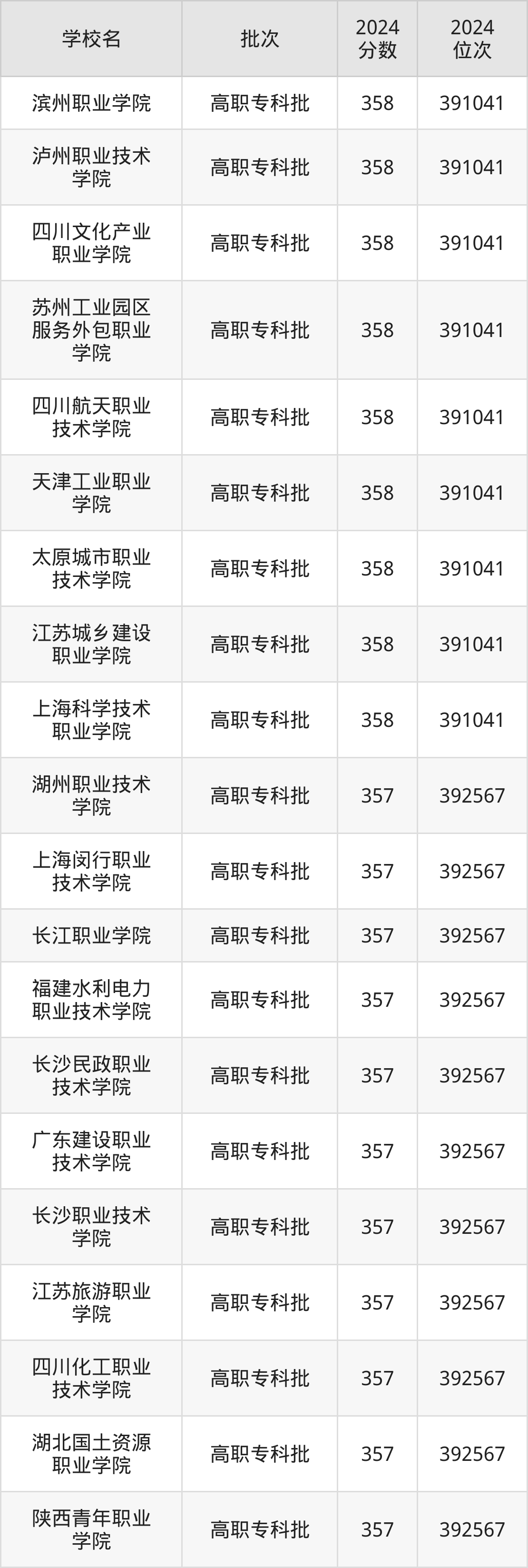 2024年河南高考理科357分(391043名~392568名)能上的大学有长江职业学院、福建水利电力职业技术学院、四川化工职业技术学院、湖州职业技术学院等。
