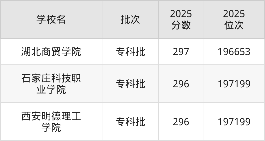 2025年河北高考历史类296分(196654名~197199名)能上的大学有石家庄科技职业学院、西安明德理工学院。