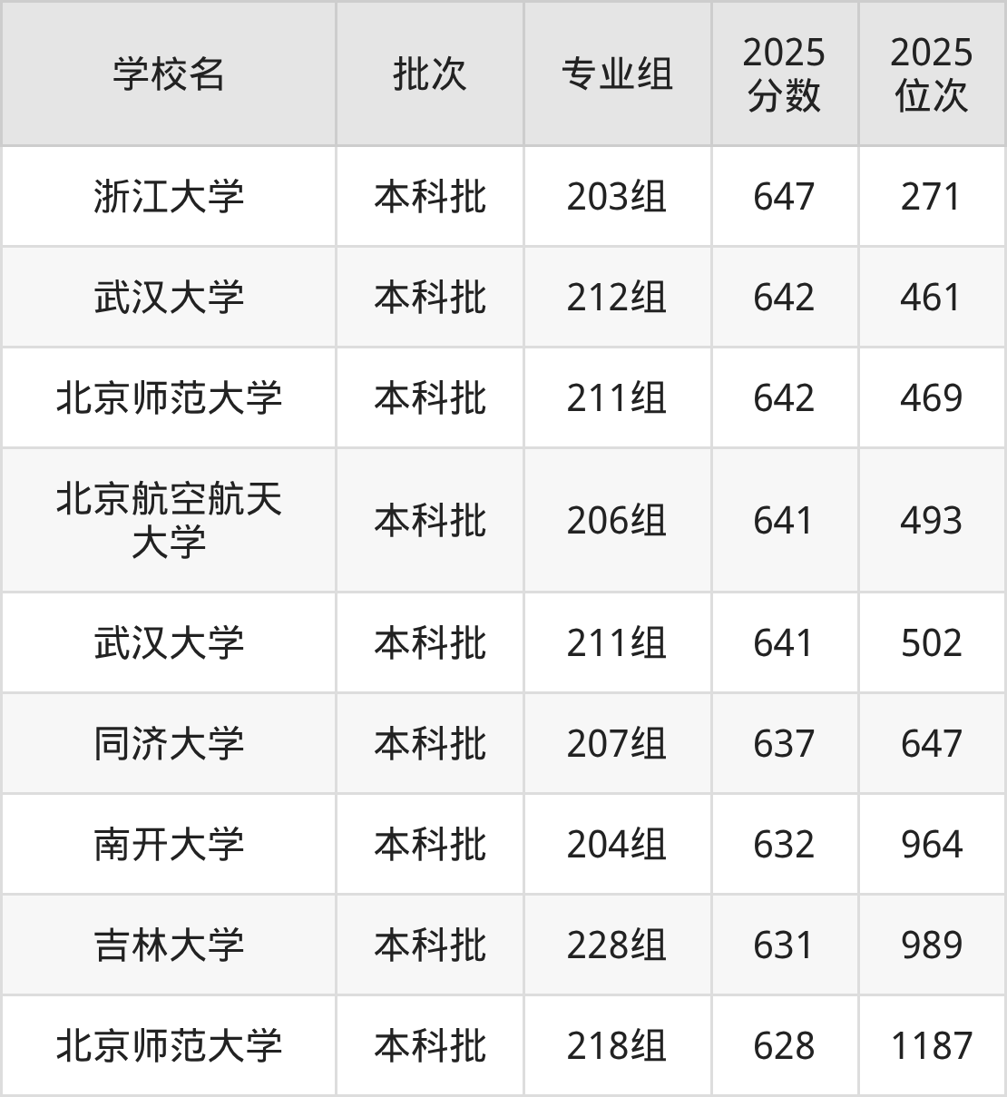 2025年广东高考历史类635分(736名~792名)录取位次低于该区间(较稳妥)的有南开大学204组(964名)、吉林大学228组(989名)等;录取位次高于该区间(可冲)的有同济大学207组(647名)、武汉大学211组(502名)等。