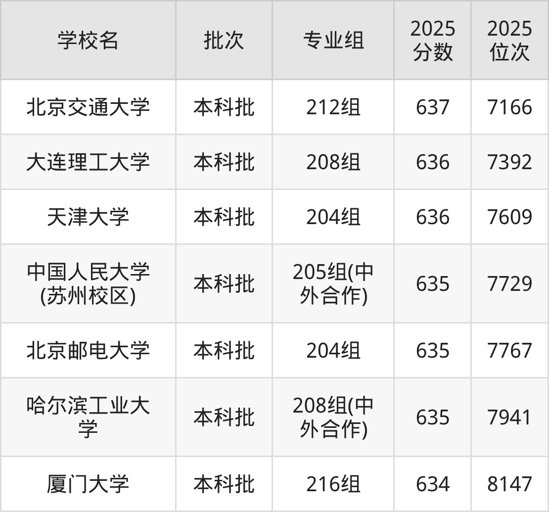 2025年广东高考物理类635分(7660名~8015名)能上的大学有北京邮电大学204组、哈尔滨工业大学208组(中外合作)、中国人民大学(苏州校区)205组(中外合作)。