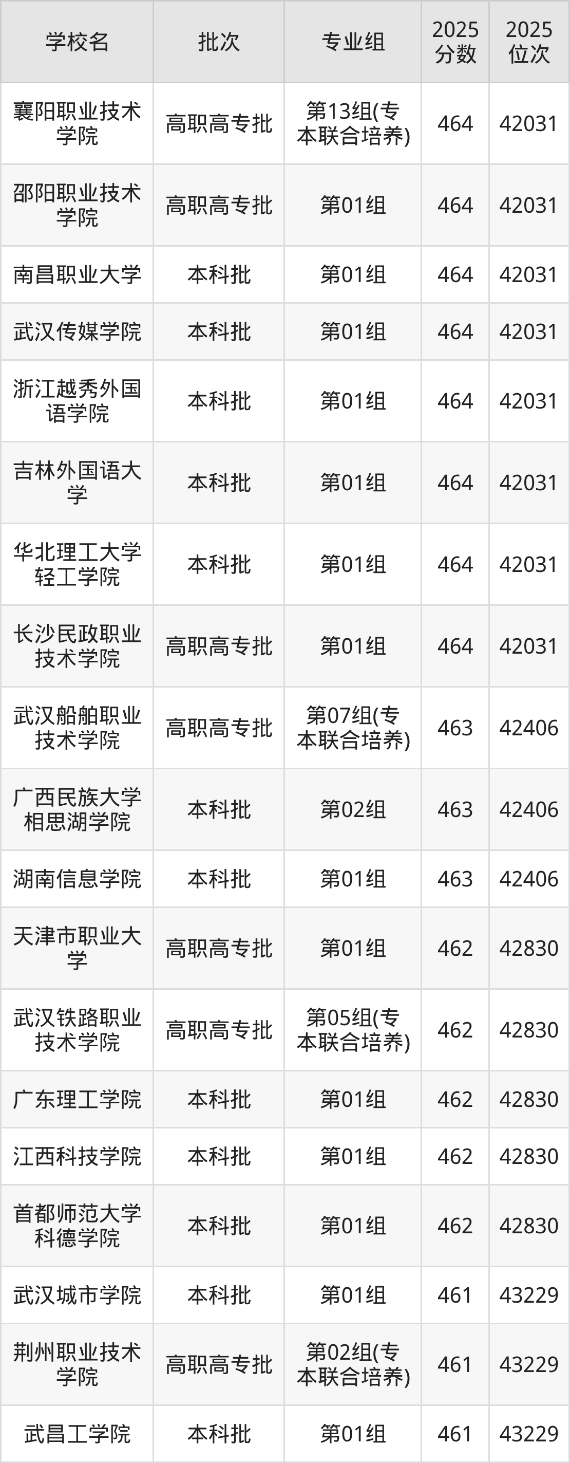 2025年湖北高考历史类462分(42407名~42830名)能上的大学有首都师范大学科德学院第01组、江西科技学院第01组、广东理工学院第01组、武汉铁路职业技术学院第05组(专本联合培养)等。