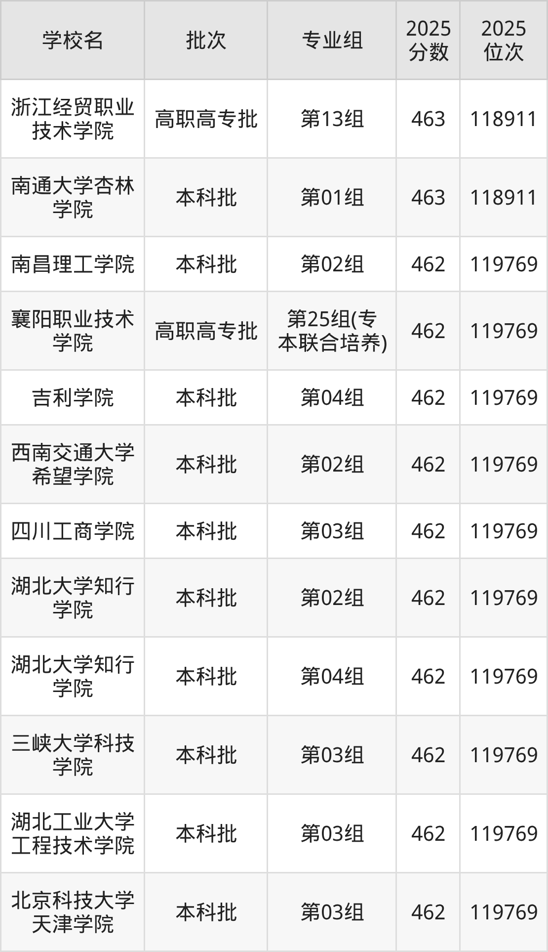 2025年湖北高考物理类462分(118912名~119769名)能上的大学有湖北大学知行学院第02组、湖北大学知行学院第04组、三峡大学科技学院第03组、湖北工业大学工程技术学院第03组等。