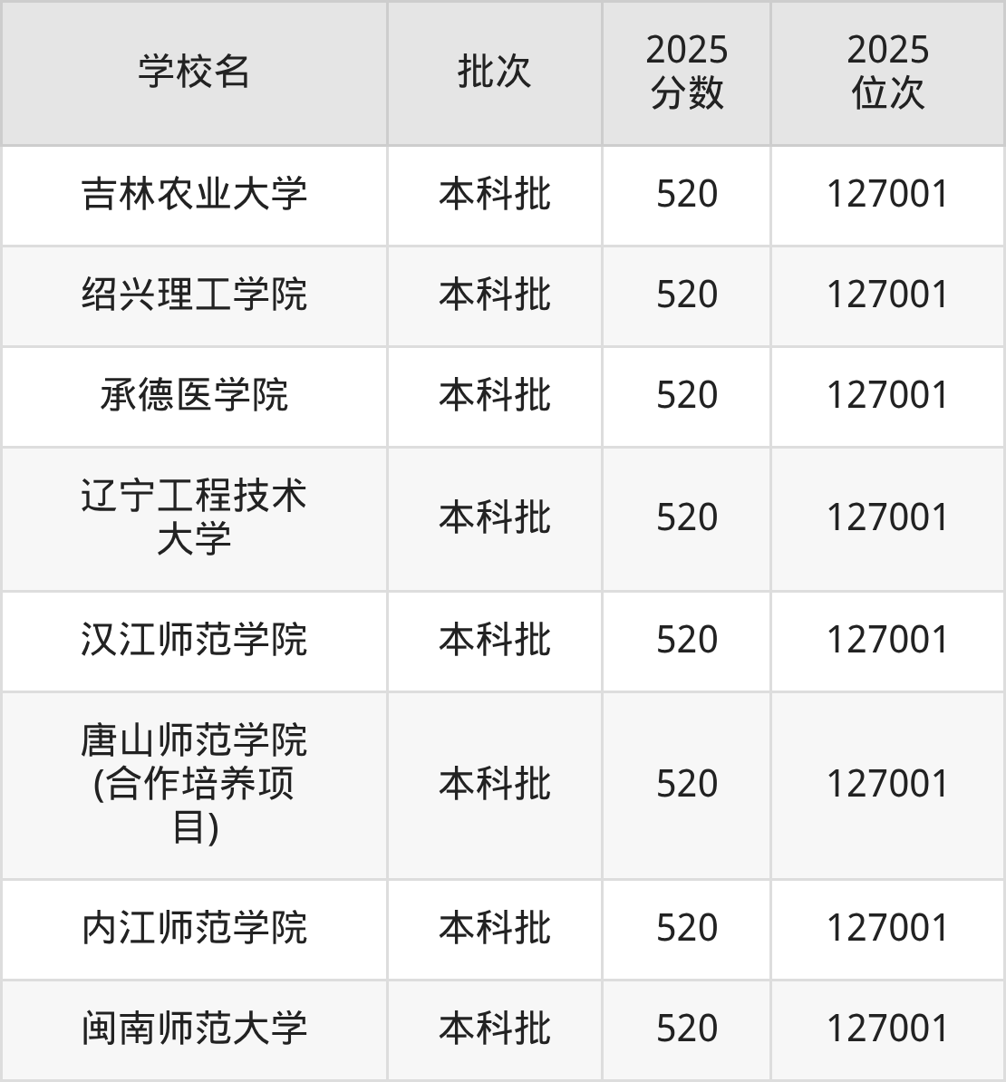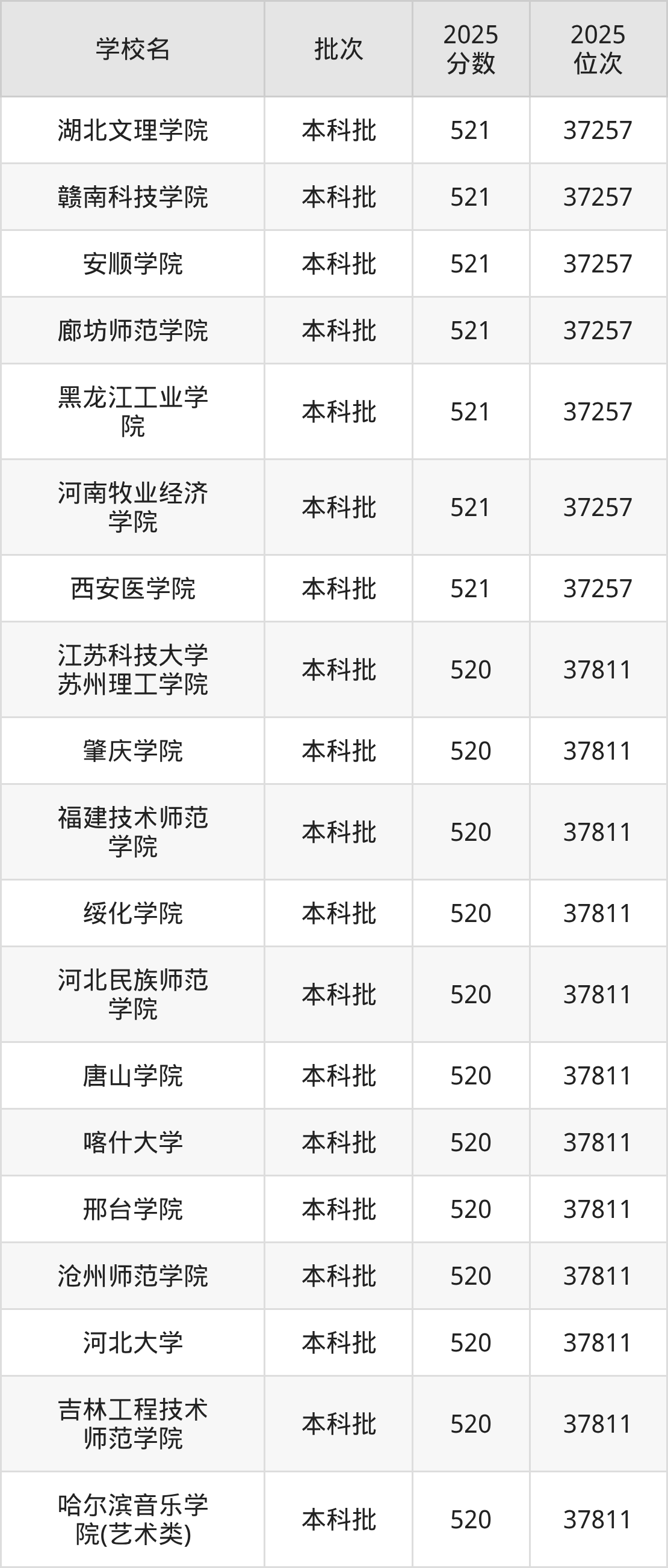 2025年河北高考历史类520分(37258名~37811名)能上的大学有哈尔滨音乐学院(艺术类)、吉林工程技术师范学院、福建技术师范学院、唐山学院等。