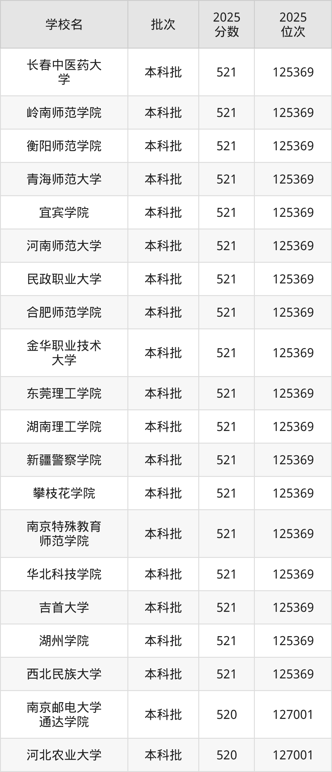 2025年河北高考物理类520分(125370名~127001名)能上的大学有承德医学院、辽宁工程技术大学、南京邮电大学通达学院、闽南师范大学等。