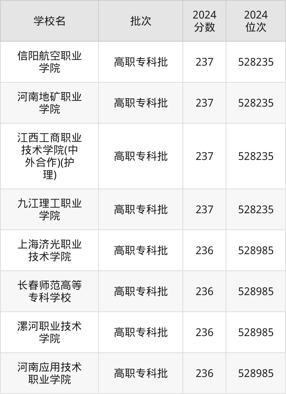 2024年河南高考理科236分(528237名~528986名)能上的大学有河南应用技术职业学院、漯河职业技术学院、上海济光职业技术学院、长春师范高等专科学校。