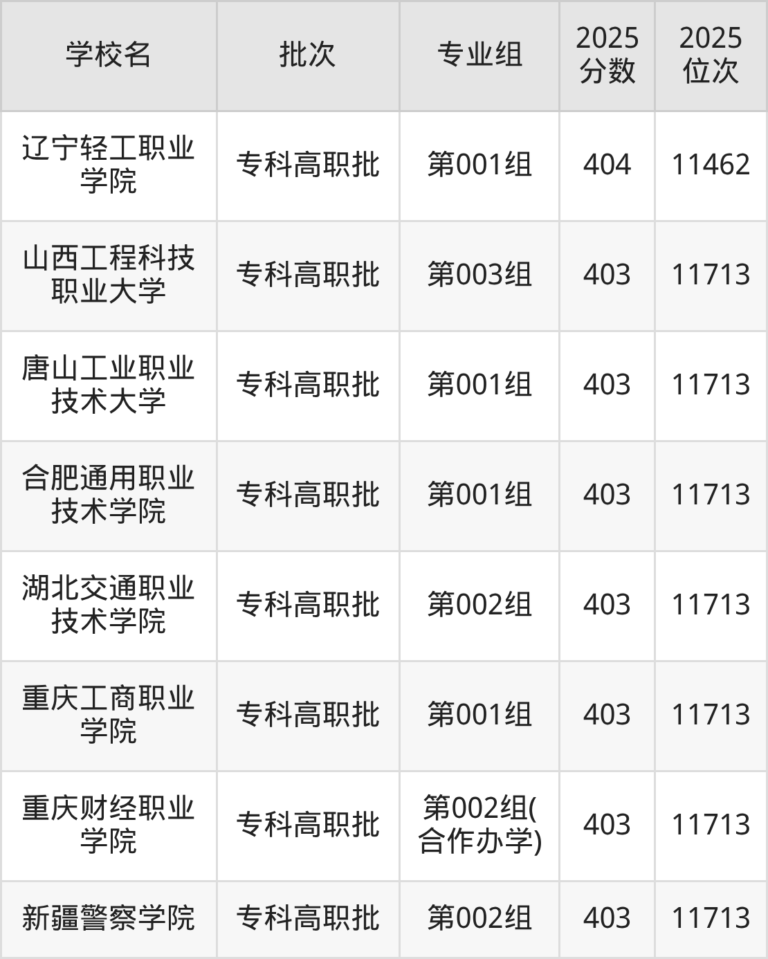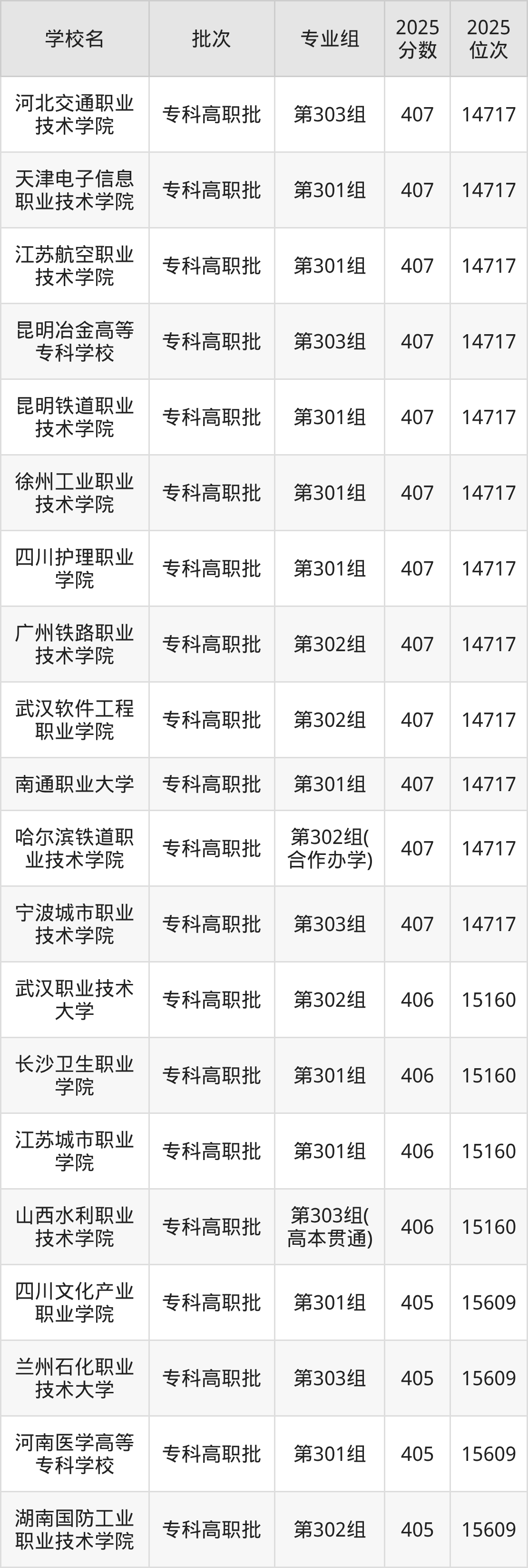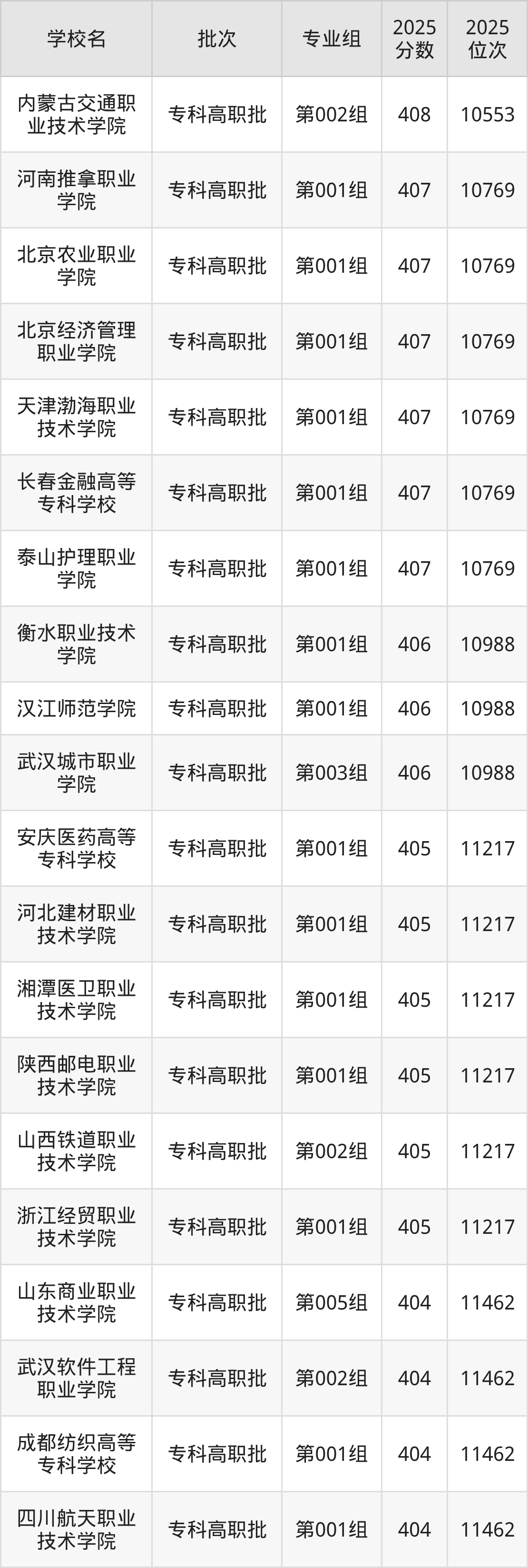 2025年山西高考历史类405分(10989名~11217名)能上的大学有河北建材职业技术学院第001组、浙江经贸职业技术学院第001组、安庆医药高等专科学校第001组、湘潭医卫职业技术学院第001组等。