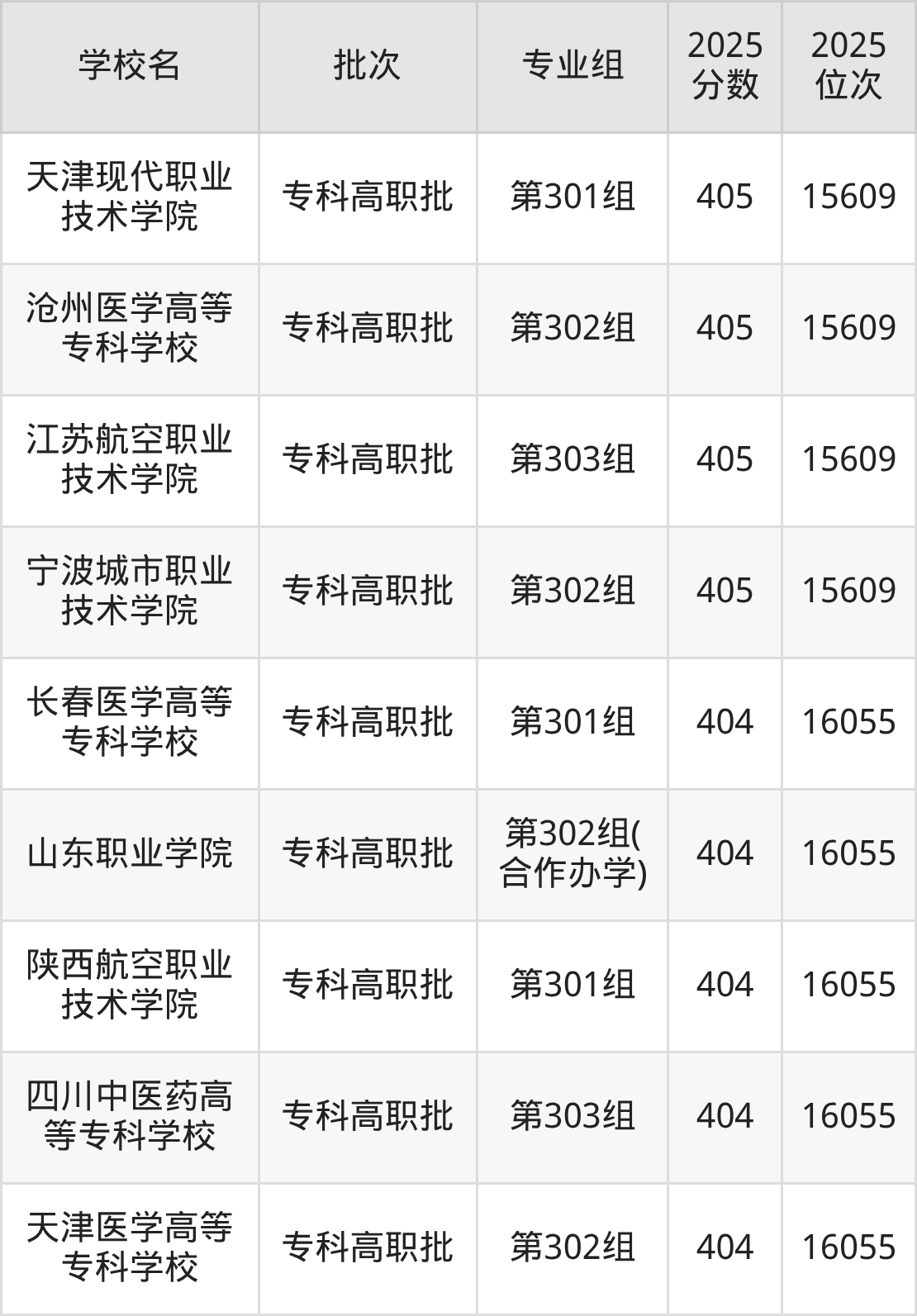 2025年山西高考物理类405分(15161名~15609名)能上的大学有天津现代职业技术学院第301组、沧州医学高等专科学校第302组、江苏航空职业技术学院第303组、宁波城市职业技术学院第302组等。