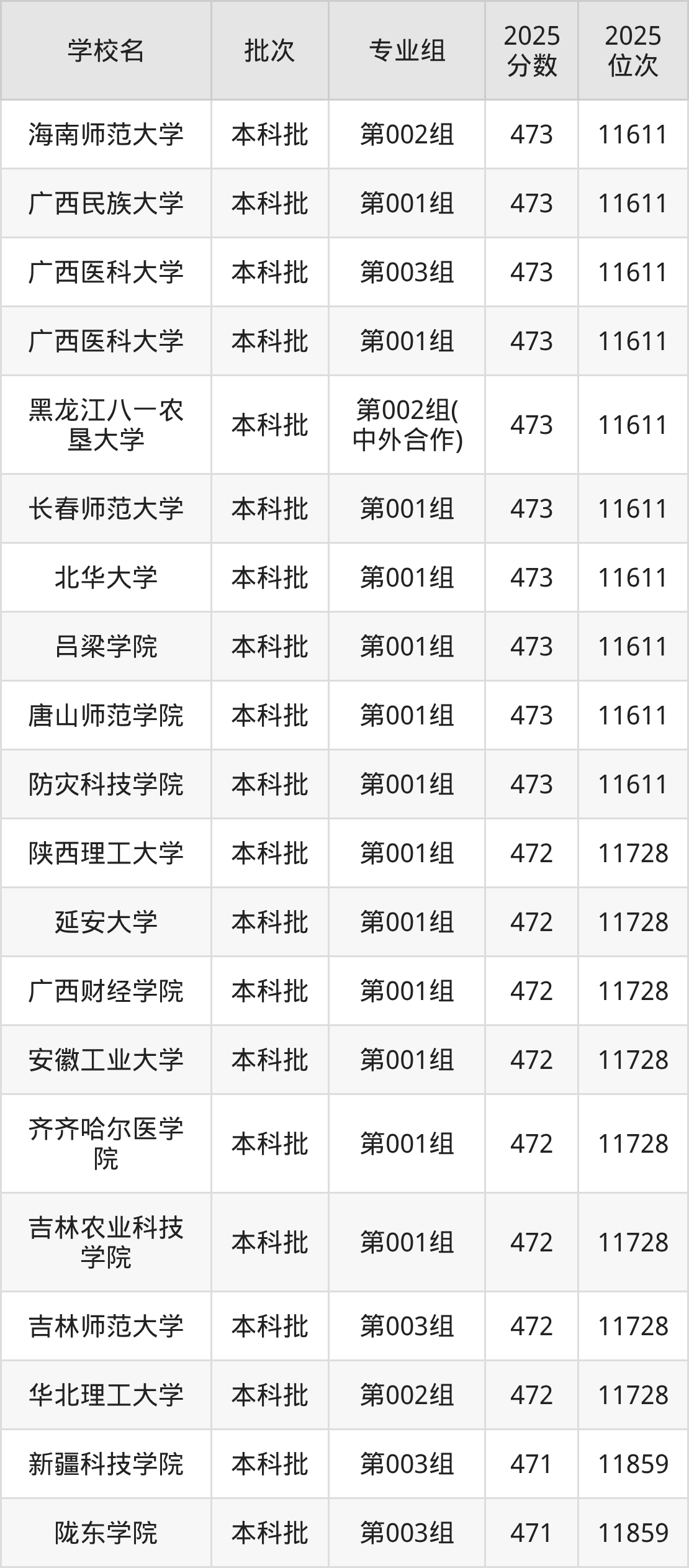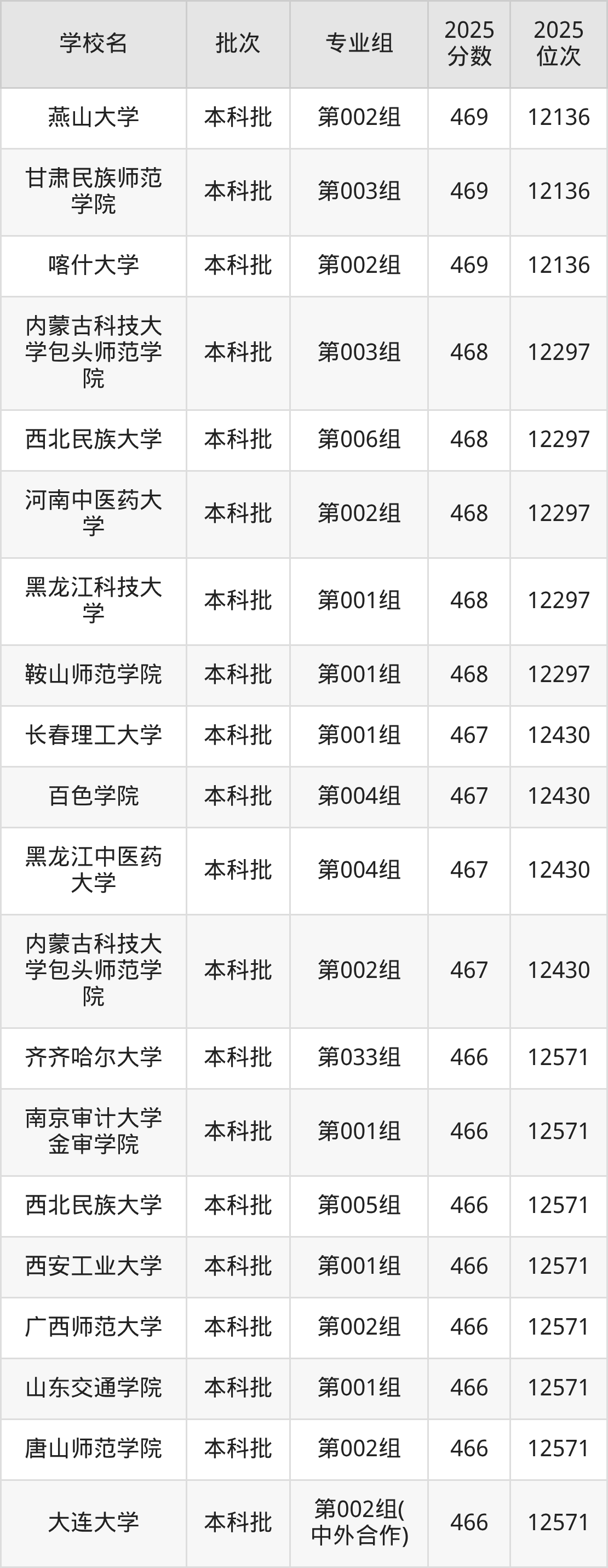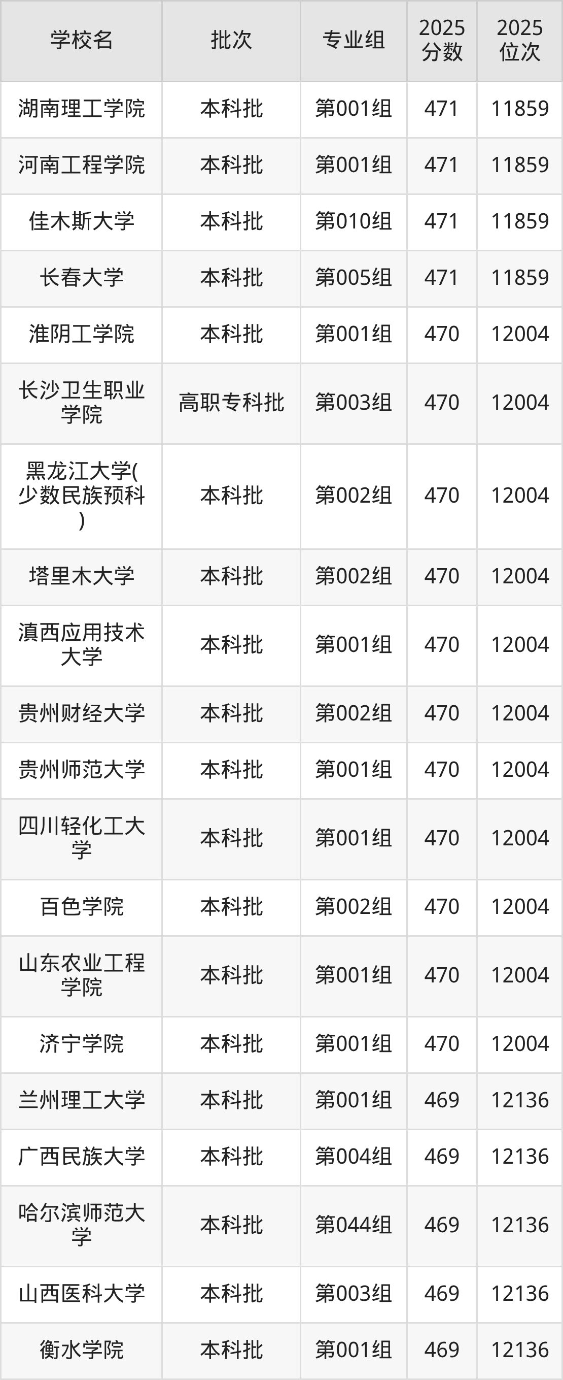 2025年黑龙江高考历史类469分(12005名~12136名)能上的大学有燕山大学第002组、衡水学院第001组、山西医科大学第003组、哈尔滨师范大学第044组等。