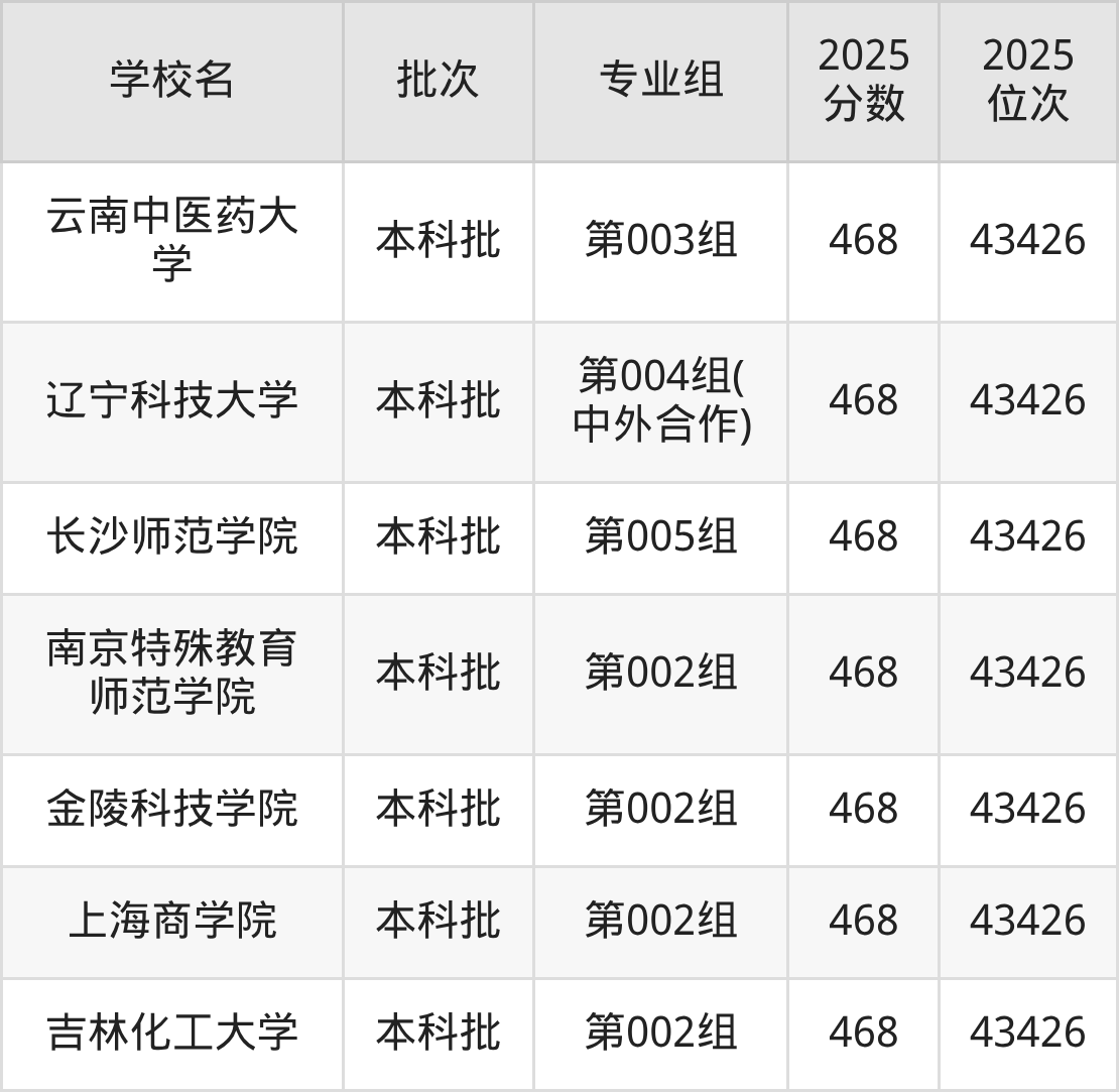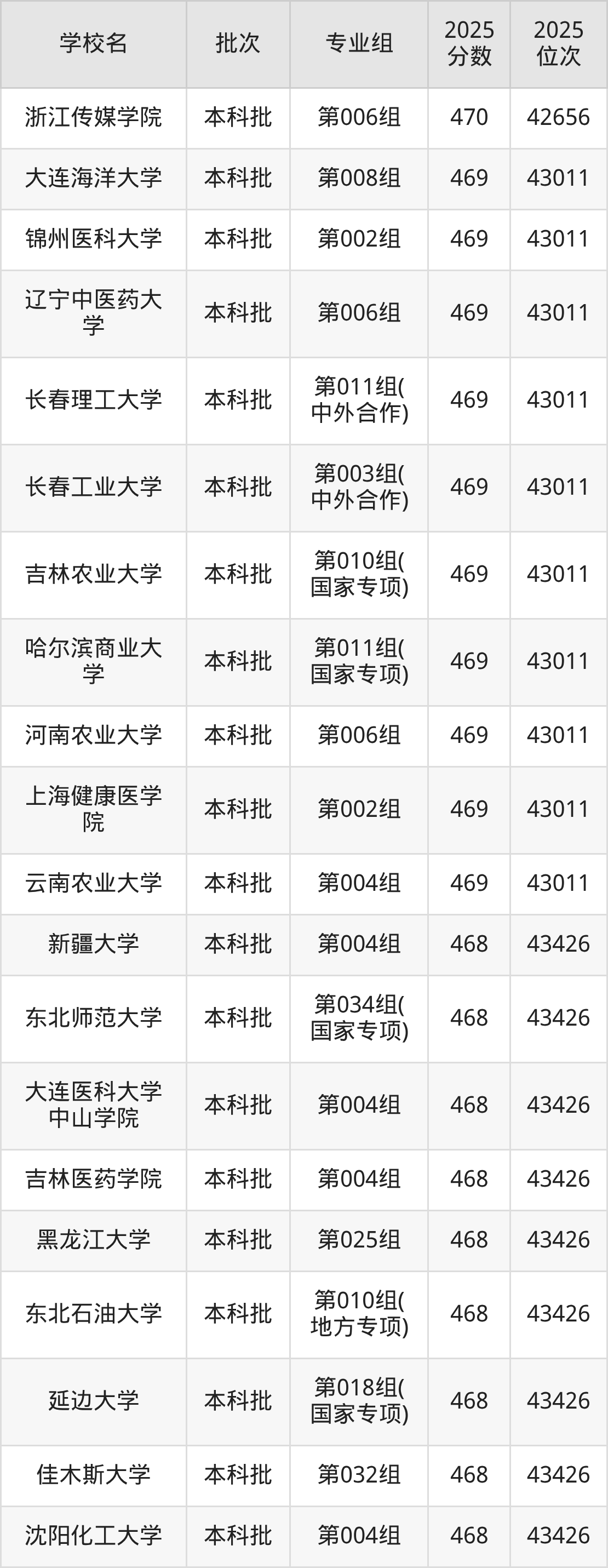 2025年黑龙江高考物理类469分(42657名~43011名)能上的大学有大连海洋大学第008组、锦州医科大学第002组、辽宁中医药大学第006组、长春理工大学第011组(中外合作)等。