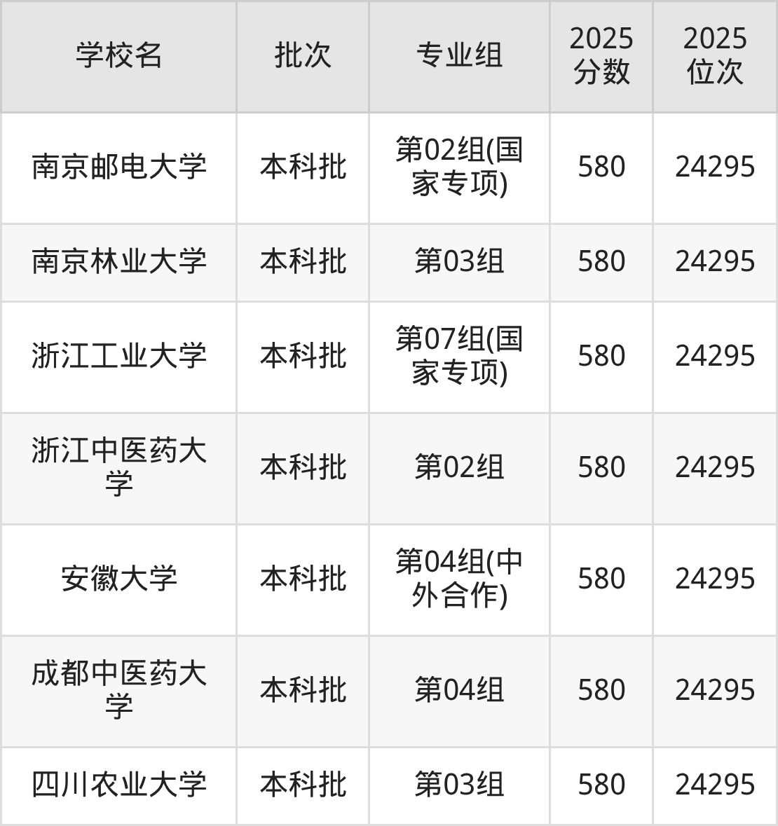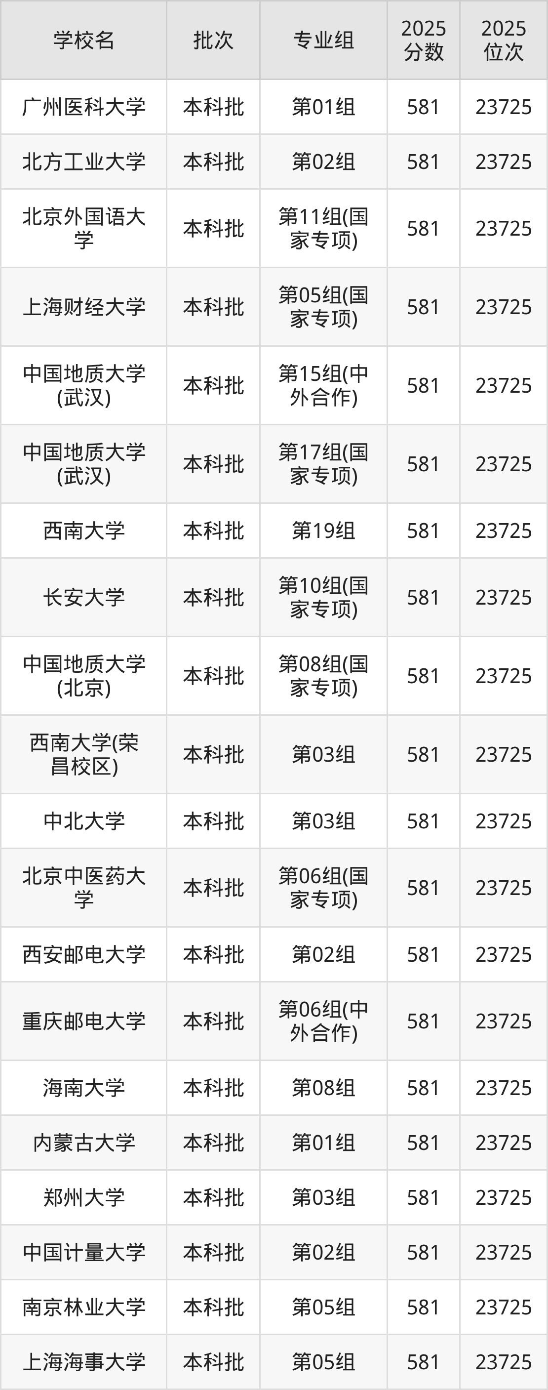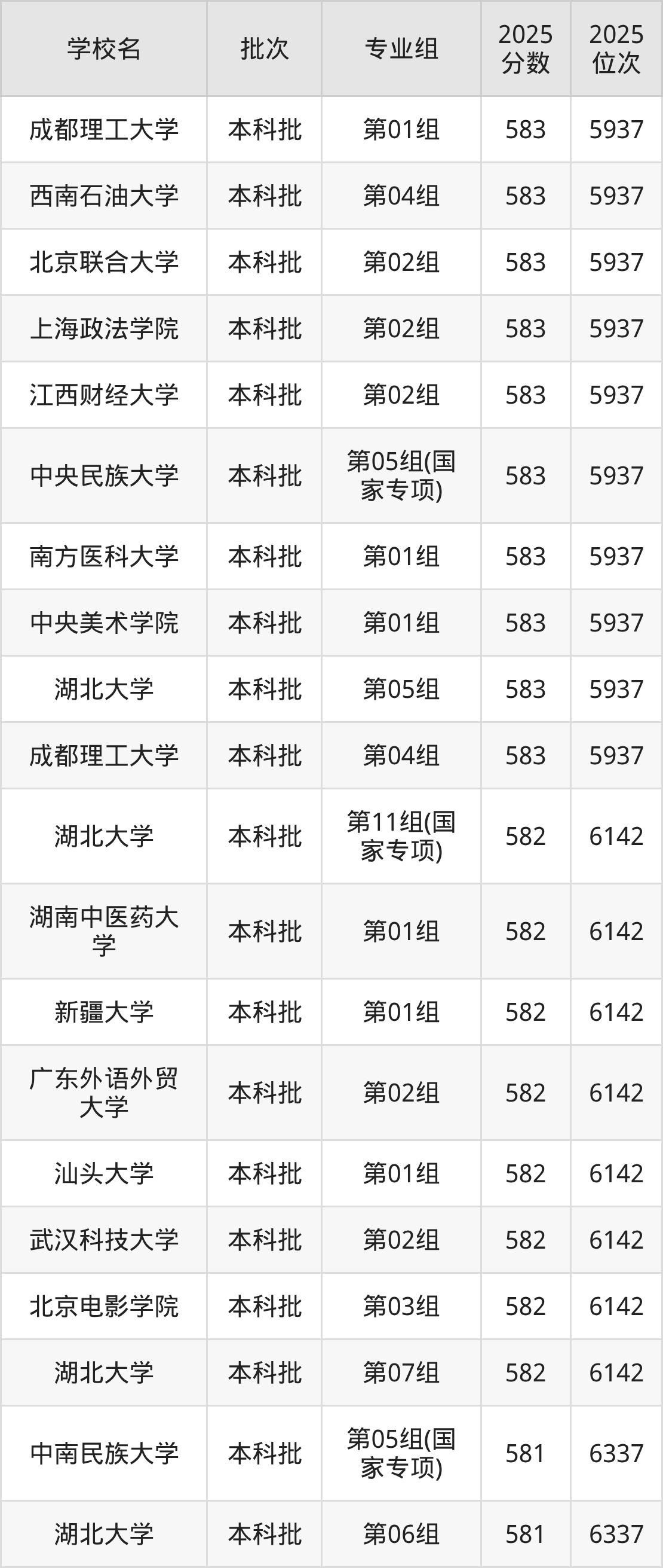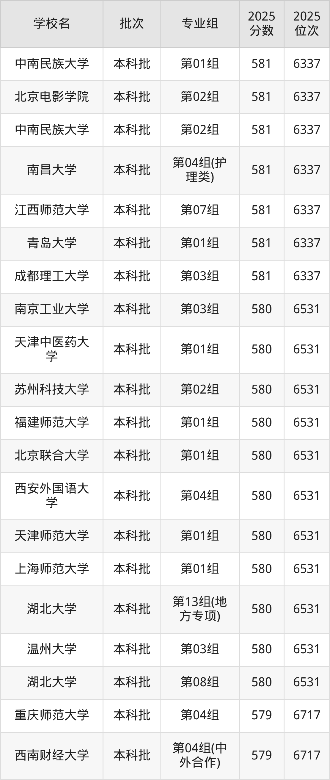 2025年湖北高考历史类580分(6338名~6531名)能上的大学有湖北大学第08组、湖北大学第13组(地方专项)、北京联合大学第01组、天津中医药大学第01组等。