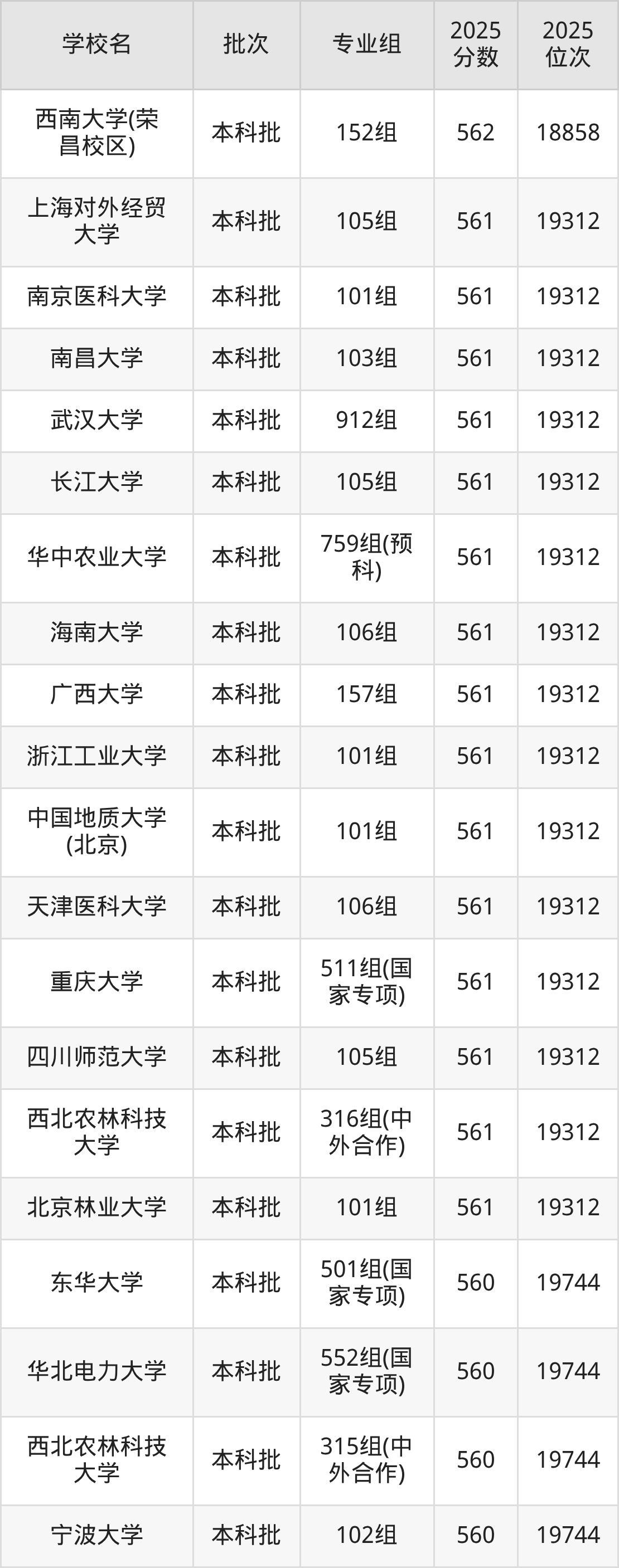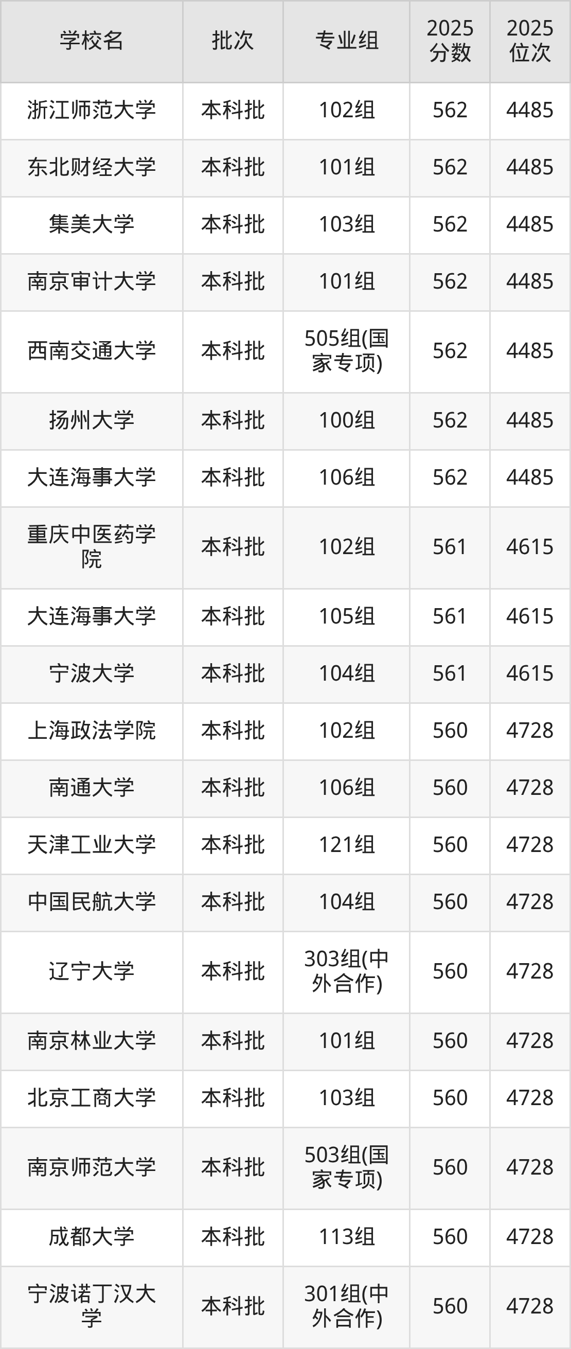 2025年广西高考历史类561分(4486名~4615名)能上的大学有大连海事大学105组、宁波大学104组、重庆中医药学院102组。