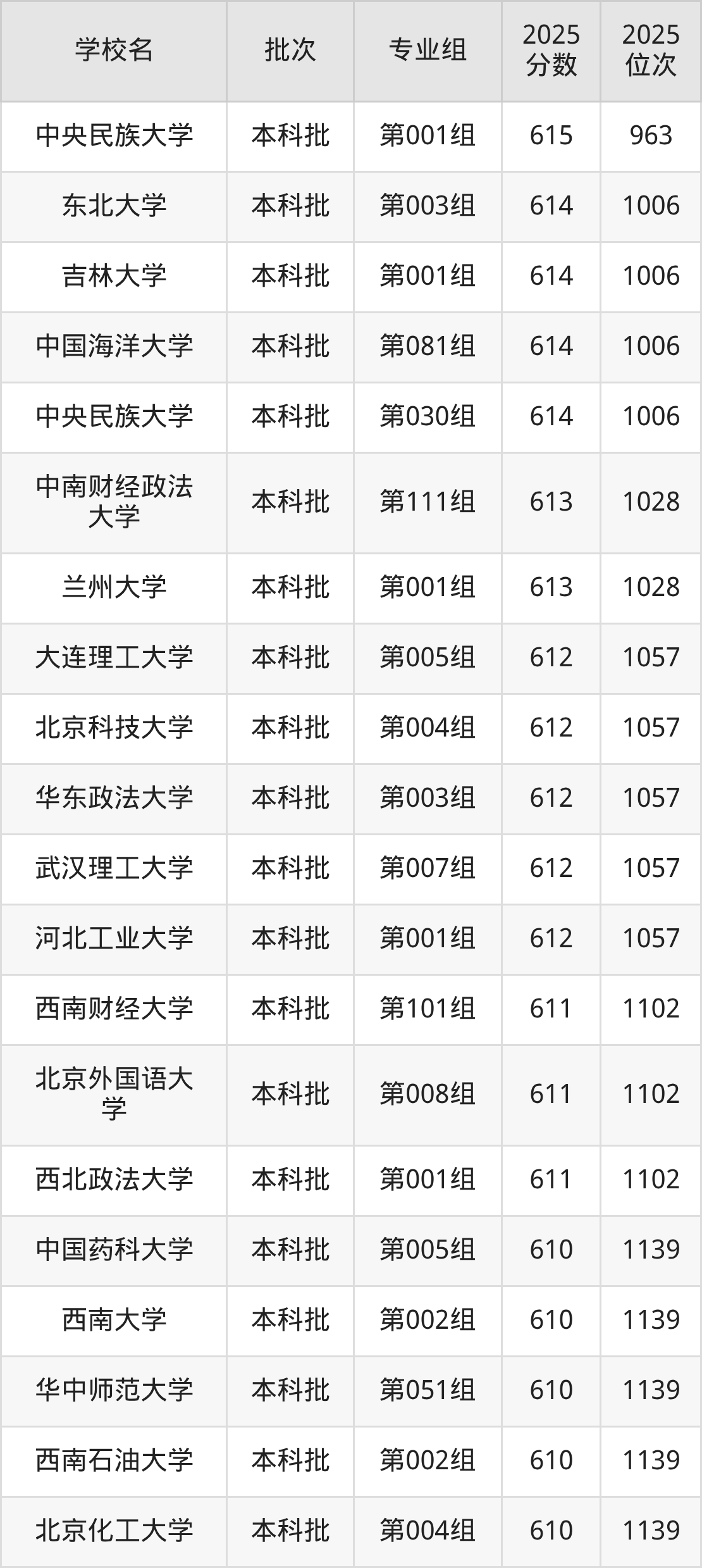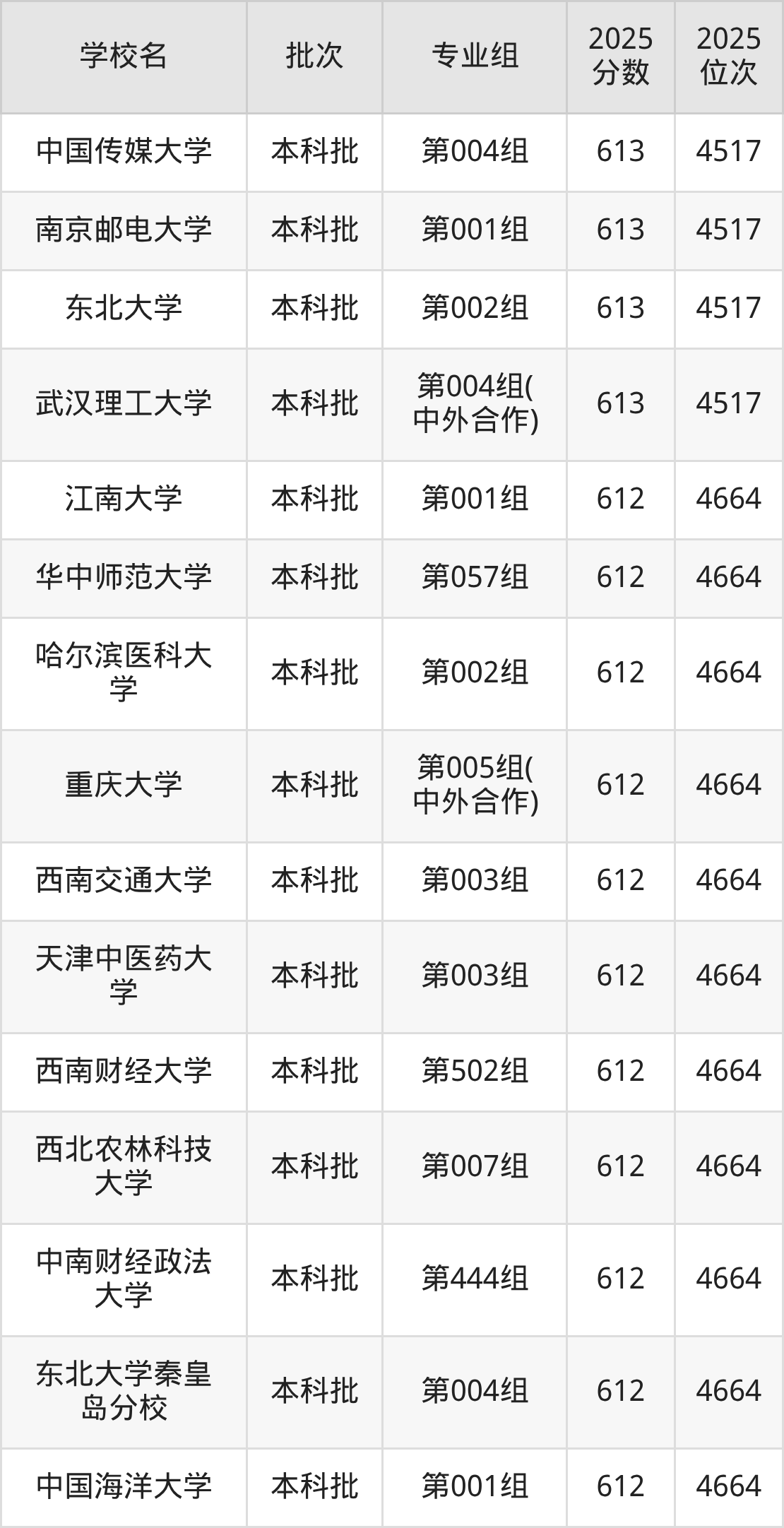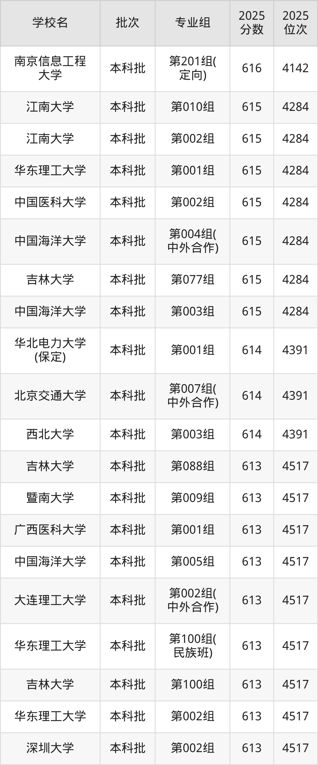 2025年内蒙古高考物理类615分(4143名~4284名)能上的大学有吉林大学第077组、中国海洋大学第003组、江南大学第002组、中国海洋大学第004组(中外合作)等。