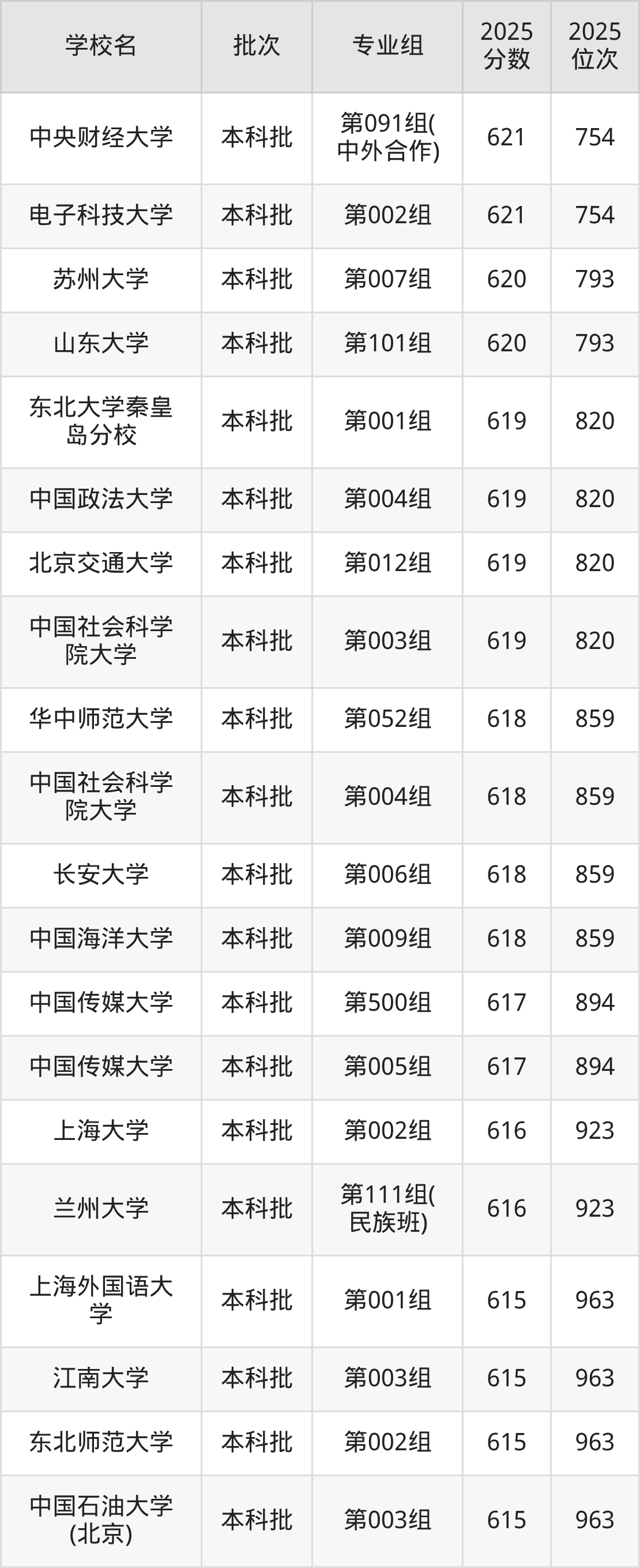 2025年内蒙古高考历史类615分(924名~963名)能上的大学有上海外国语大学第001组、中央民族大学第001组、中国石油大学(北京)第003组、东北师范大学第002组等。