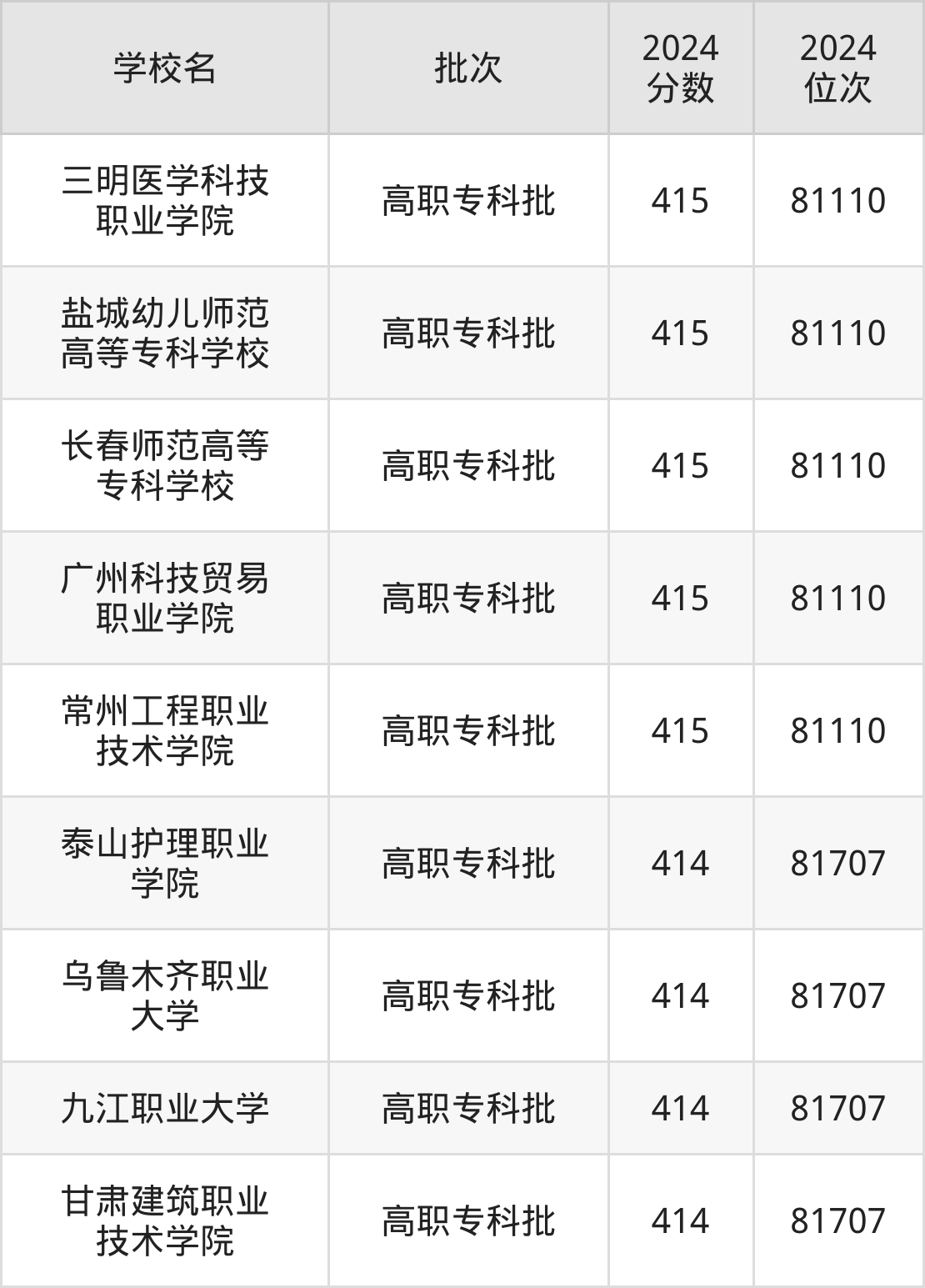 2024年云南高考文科414分(81111名~81707名)能上的大学有泰山护理职业学院、乌鲁木齐职业大学、九江职业大学、甘肃建筑职业技术学院。