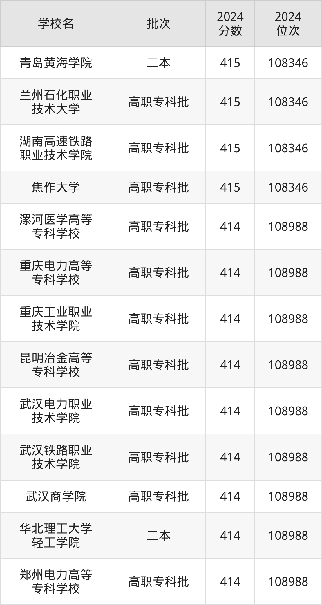 2024年云南高考理科414分(108347名~108988名)能上的大学有华北理工大学轻工学院、郑州电力高等专科学校、漯河医学高等专科学校、武汉商学院等。
