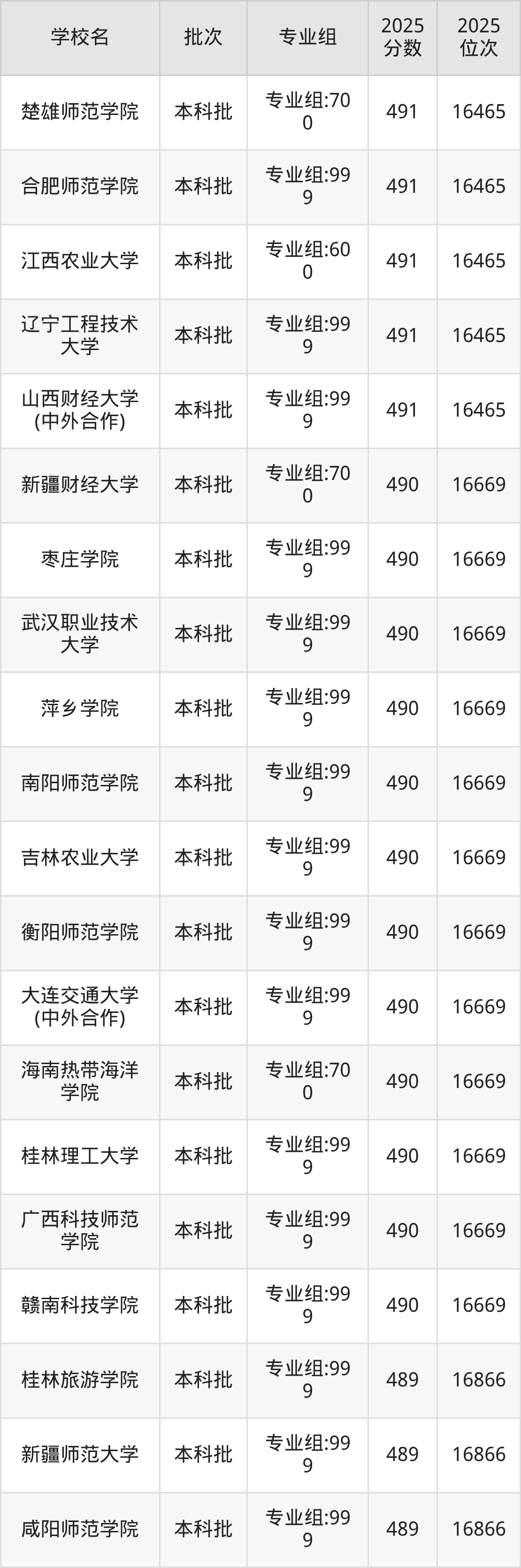 2025年福建高考历史类490分(16466名~16669名)能上的大学有大连交通大学(中外合作)专业组:999、赣南科技学院专业组:999、广西科技师范学院专业组:999、桂林理工大学专业组:999等。