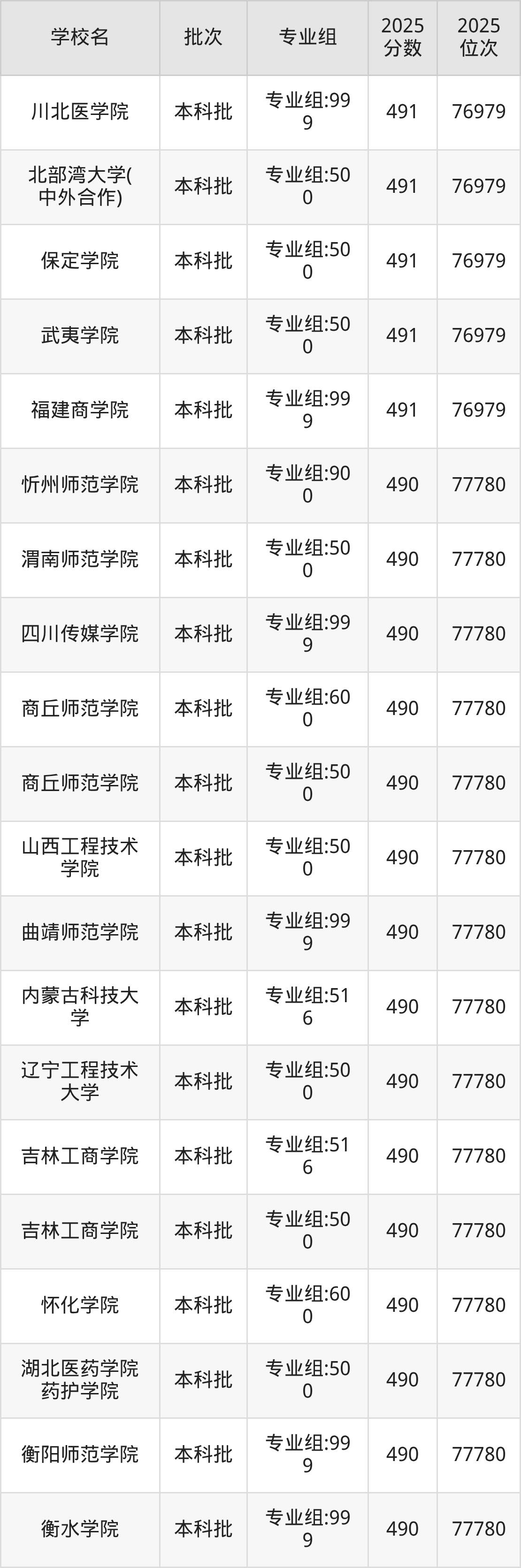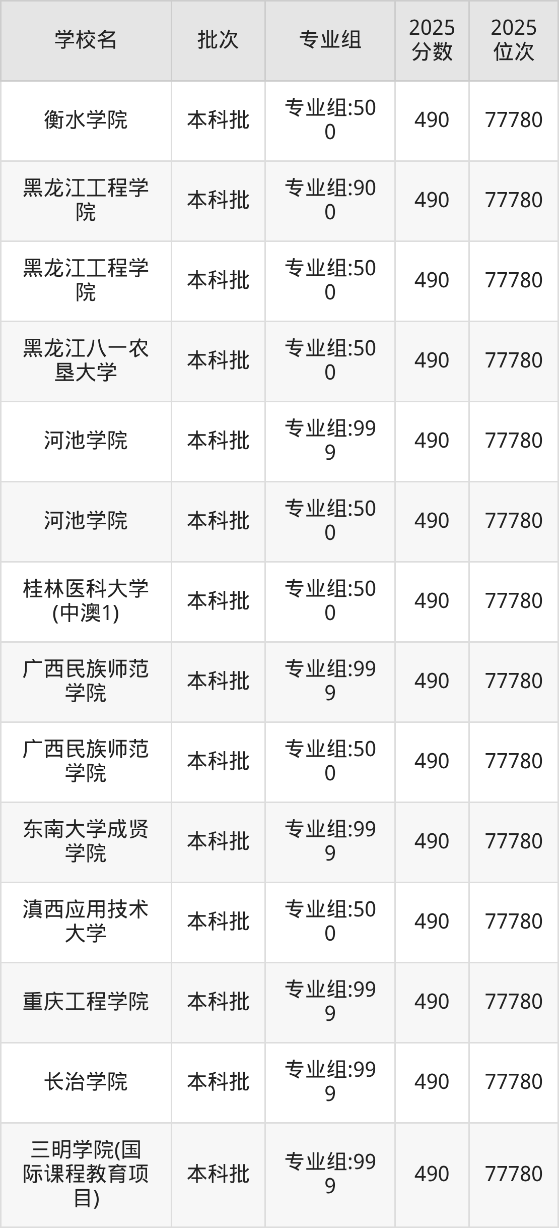 2025年福建高考物理类490分(76980名~77780名)能上的大学有三明学院(国际课程教育项目)专业组:999、长治学院专业组:999、重庆工程学院专业组:999、滇西应用技术大学专业组:500等。