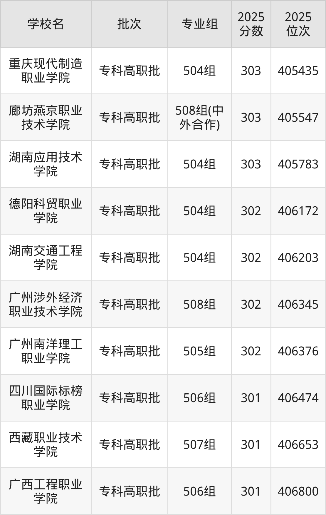 另外录取位次低于该区间(较稳妥)的有四川国际标榜职业学院506组(406474名)、西藏职业技术学院507组(406653名)等;录取位次高于该区间(可冲)的有湖南应用技术学院504组(405783名)、廊坊燕京职业技术学院508组(中外合作)(405547名)等。