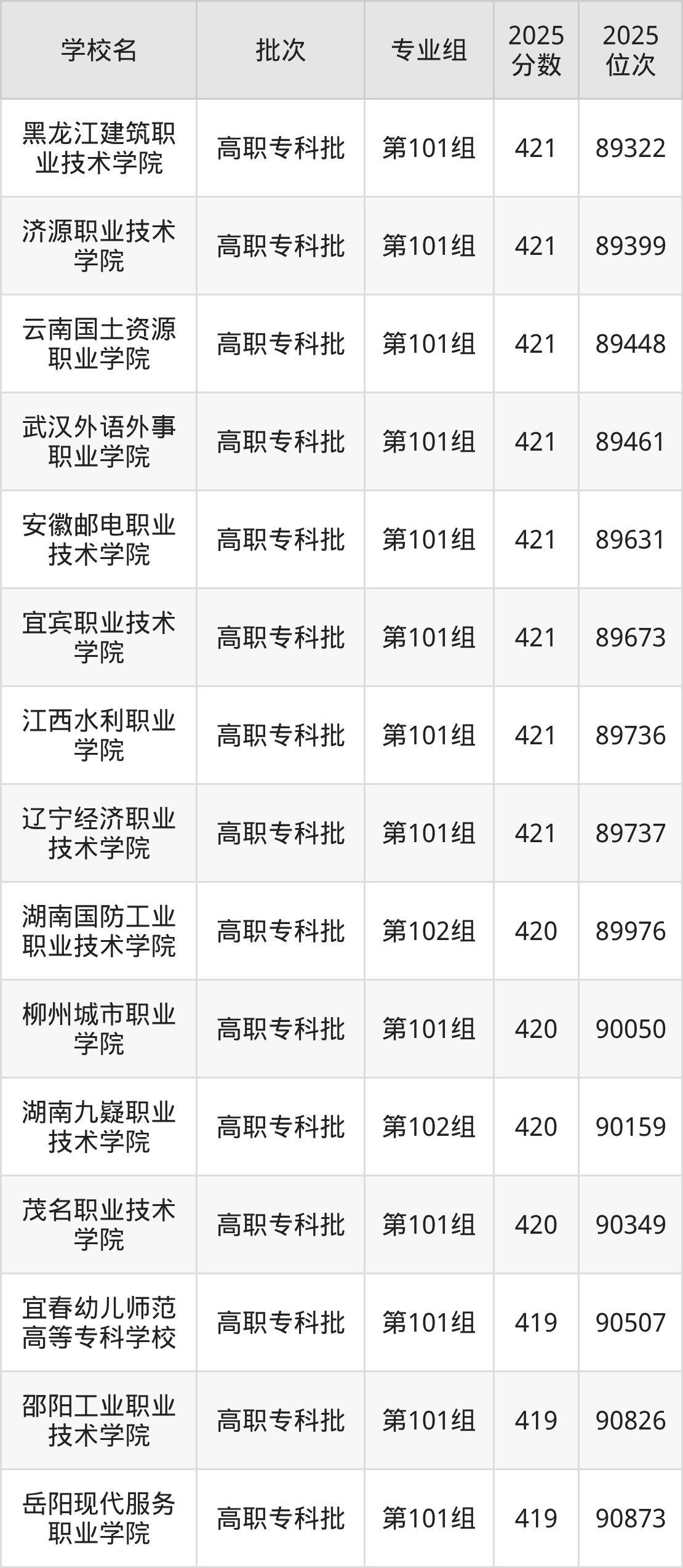 2025年江西高考历史类420分(89822名~90490名)能上的大学有湖南九嶷职业技术学院第102组、柳州城市职业学院第101组、茂名职业技术学院第101组、湖南国防工业职业技术学院第102组。