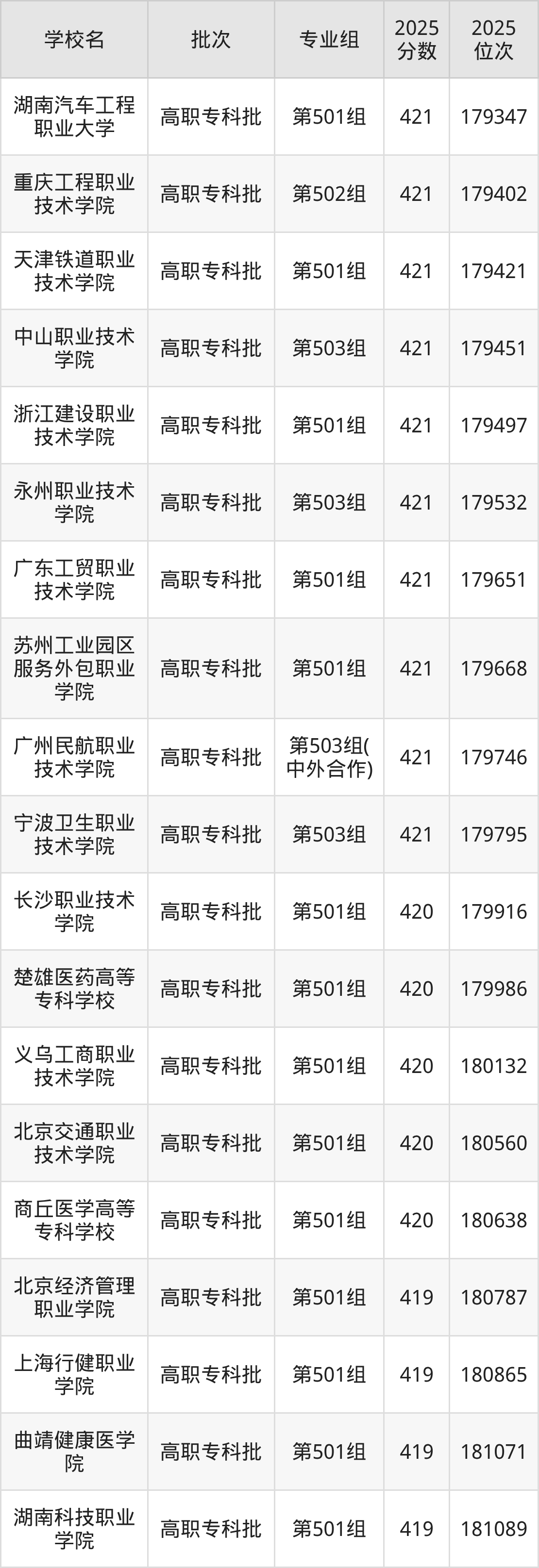 2025年江西高考物理类420分(179796名~180751名)能上的大学有商丘医学高等专科学校第501组、长沙职业技术学院第501组、楚雄医药高等专科学校第501组、北京交通职业技术学院第501组等。