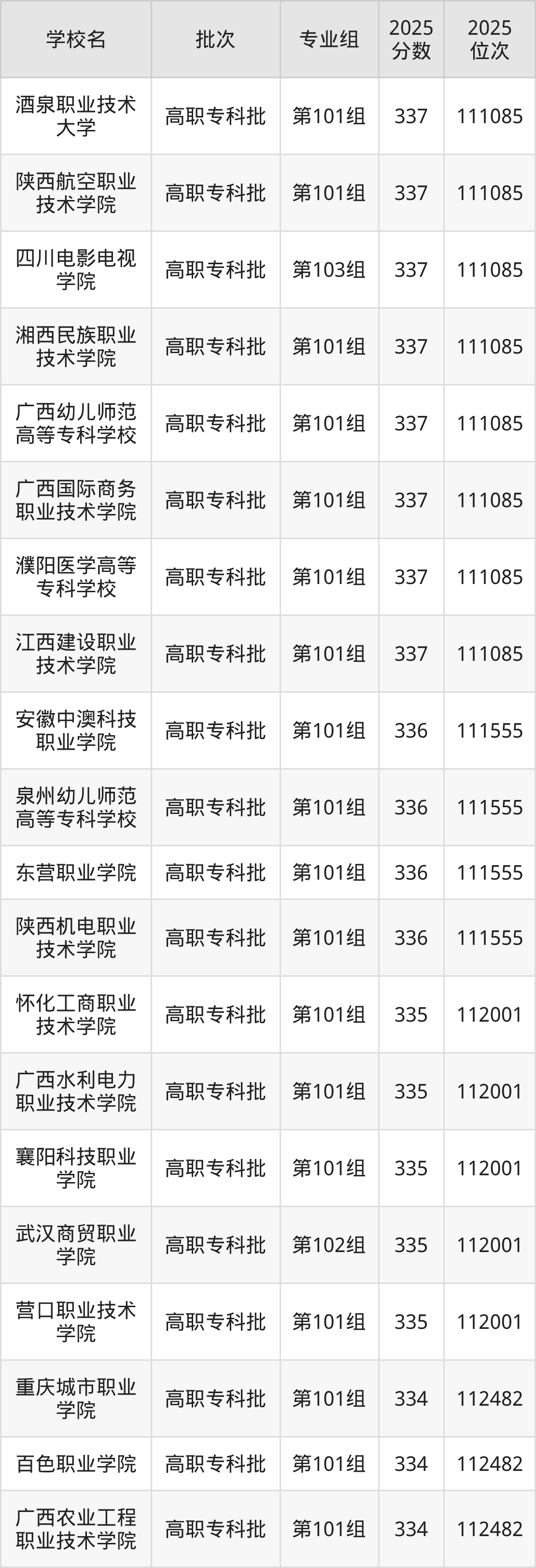 2025年湖南高考历史类335分(111556名~112001名)能上的大学有营口职业技术学院第101组、武汉商贸职业学院第102组、襄阳科技职业学院第101组、广西水利电力职业技术学院第101组等。