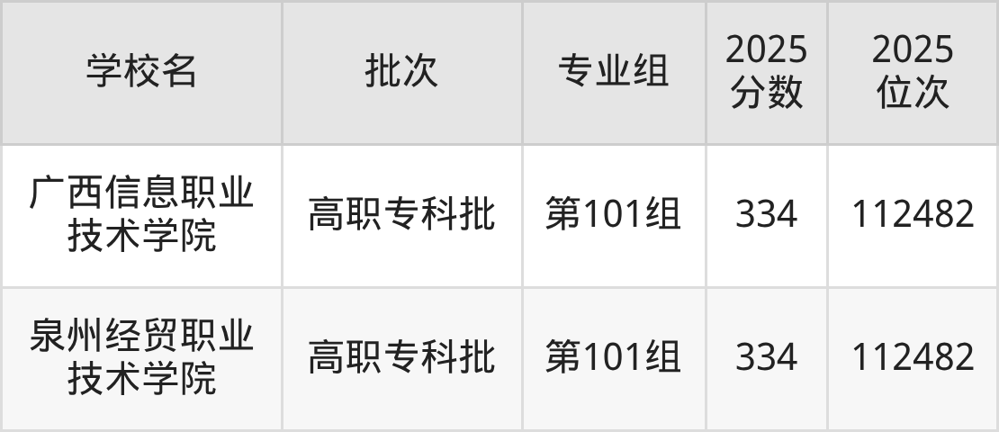 另外录取位次低于该区间(较稳妥)的有百色职业学院第101组(112482名)、广西农业工程职业技术学院第101组(112482名)等;录取位次高于该区间(可冲)的有泉州幼儿师范高等专科学校第101组(111555名)、东营职业学院第101组(111555名)等。