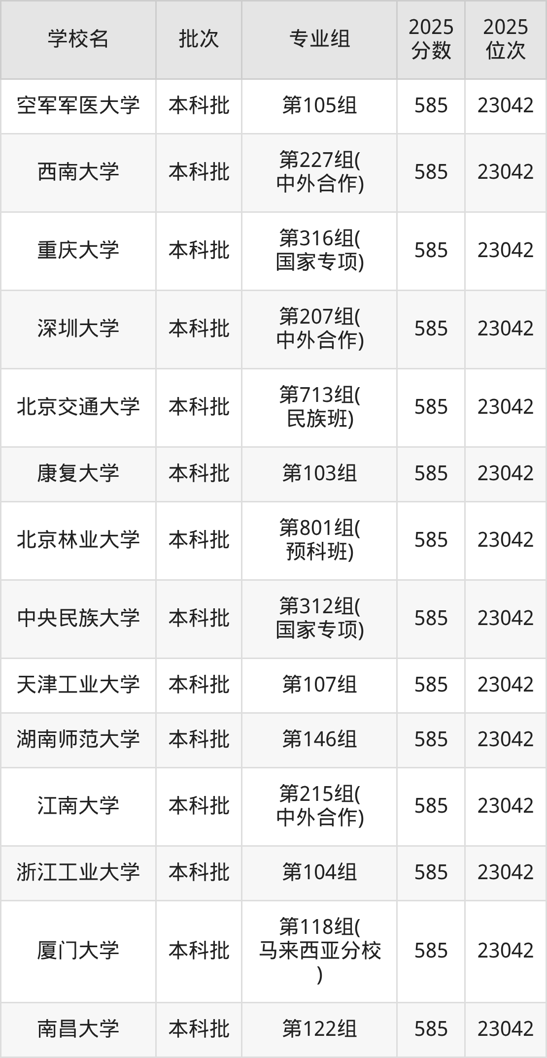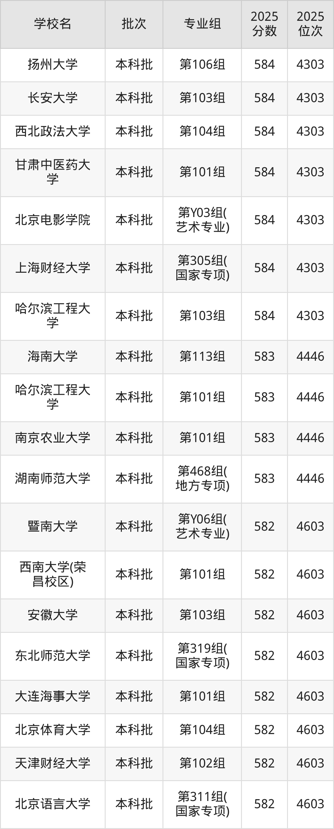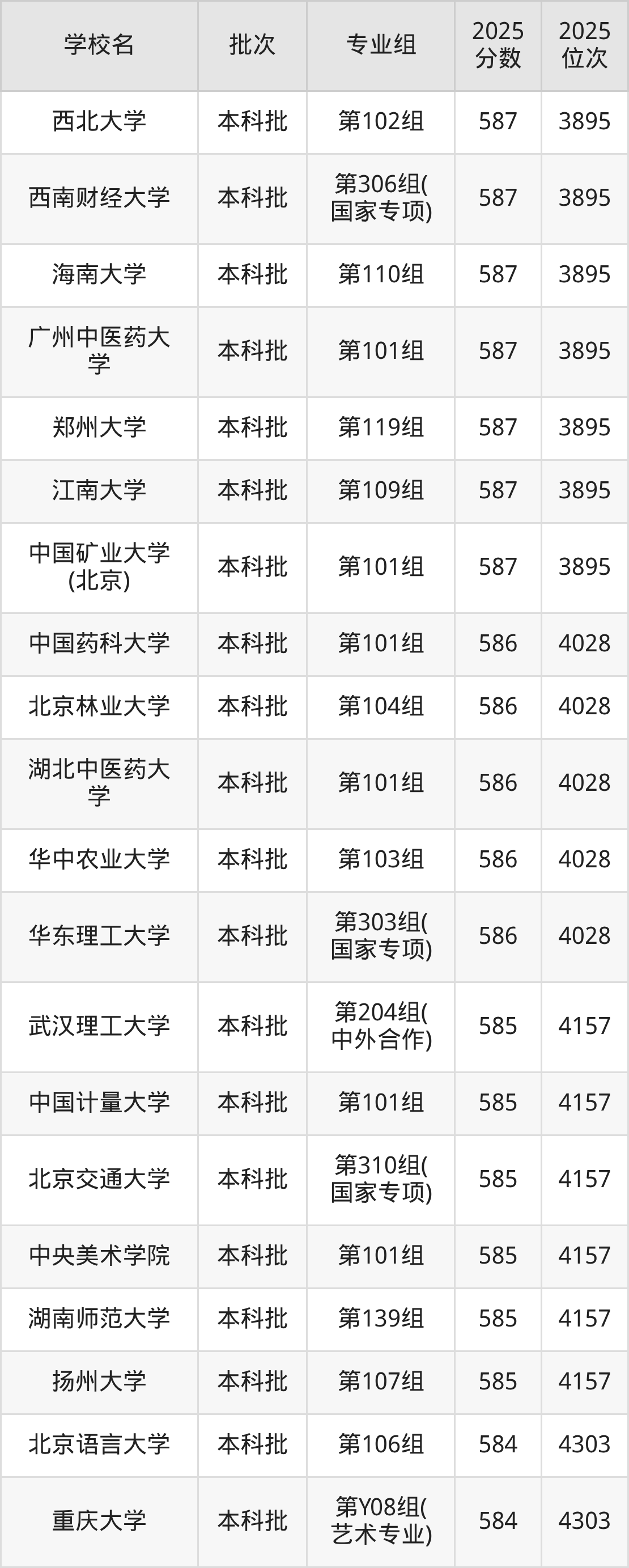 2025年湖南高考历史类585分(4029名~4157名)能上的大学有北京交通大学第310组(国家专项)、中央美术学院第101组、扬州大学第107组、中国计量大学第101组等。