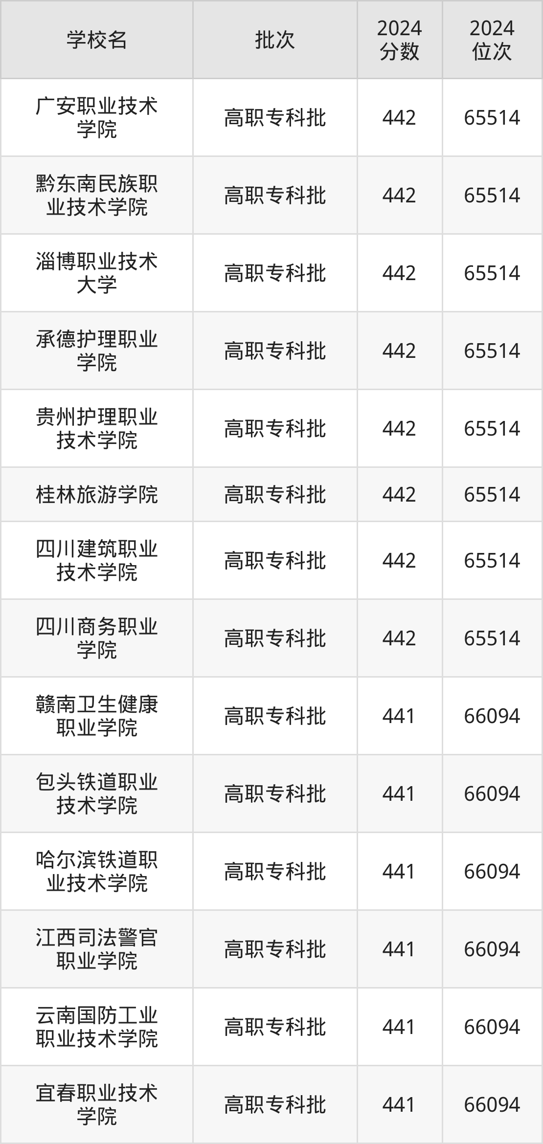 2024年云南高考文科441分(65515名~66094名)能上的大学有包头铁道职业技术学院、哈尔滨铁道职业技术学院、江西司法警官职业学院、宜春职业技术学院等。